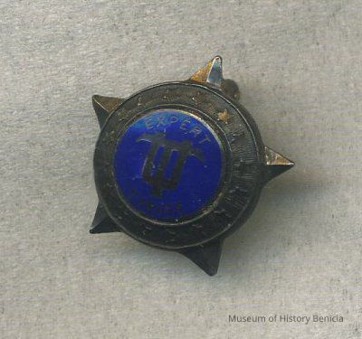 Lapel pin 5/8" in diameter; circle on a five point star; blue enamel in center with a logo and the words "Expert Typist" in gray; around the edge of the circle are stars; could be sterling.Collection