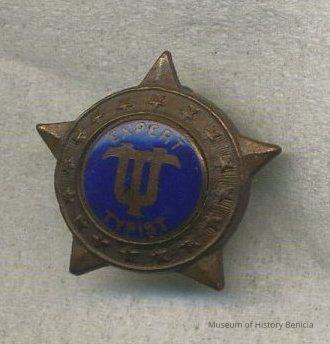 Lapel pin 5/8" in diameter; circle on a five point star; blue enamel in center with a logo and the words "Expert Typist" in gray; around the edge of the circle are stars; could be sterling.Collection