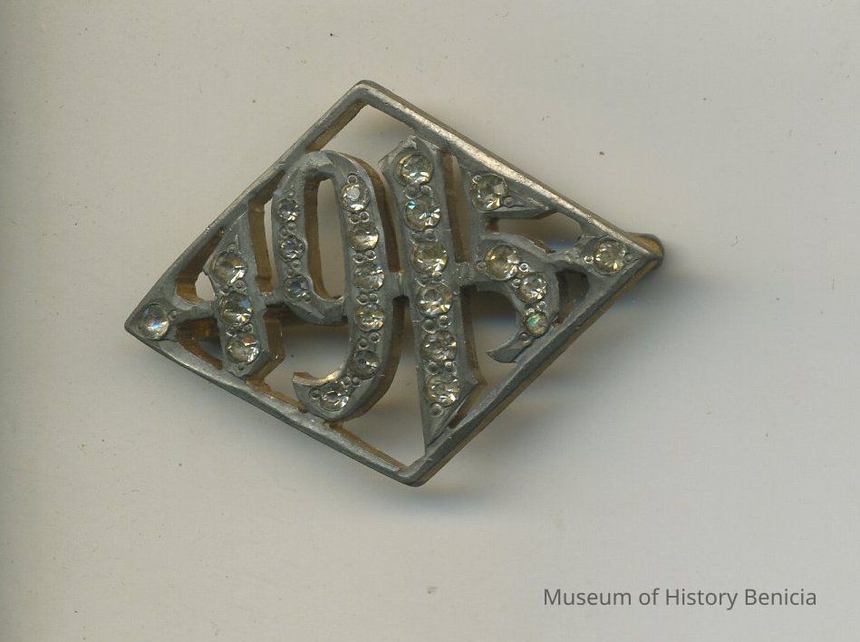 Silver metal in diamond shape with "1915" in center; picked out in clear faceted rhinestones; gold wash on back 1-1/8" long x 1-1/2" wide