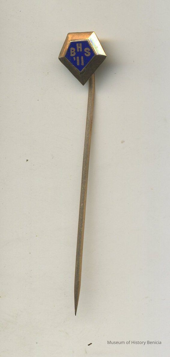Brassy stick pin with entagon shaped head with blue center with "BHS '11" in center 2-3/8" long x 7/8" wide