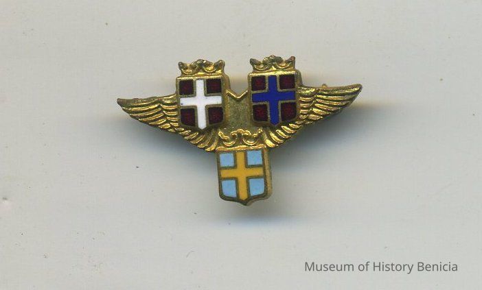 Pin - brass wings with three shields that have enameled crosses on them; significance is unknown; 7/8" x 1/2"