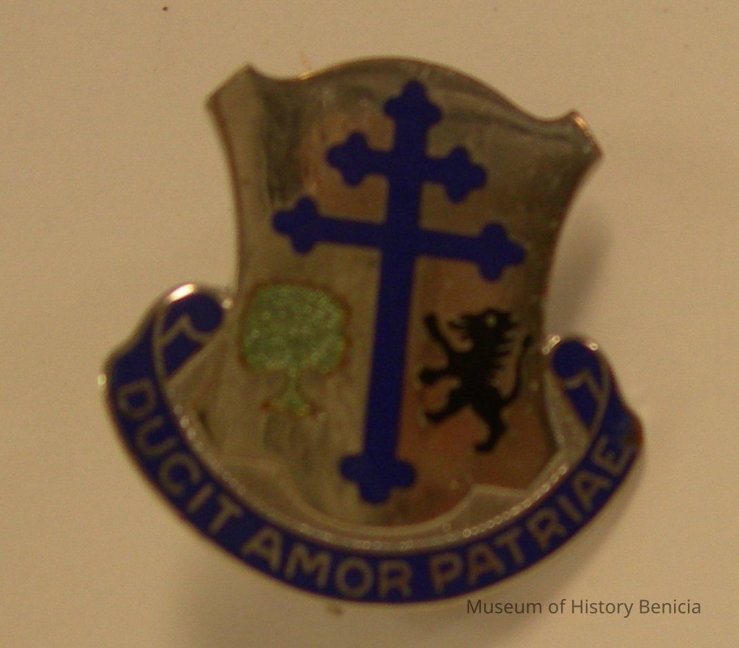 Pin - Army Crest for 361st Regiment Brigade Combat Team; Blue stylized Crusader Cross in center with a tree on one side and a standing lion on the other; "Ducit Amor Patriae" (translation "Led by Love of Country") at the bottom; blue and silver with no maker's mark on the back; size: 1-1/8" x 1-1/4".Collection