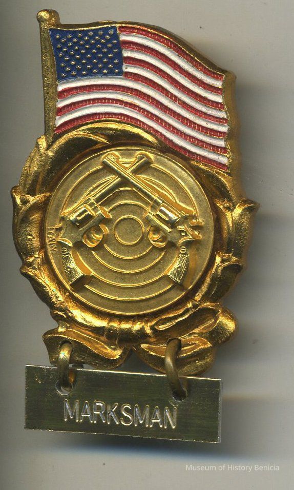 America Flag above a circle with two guns whose barrels are crossed, a small rectangle with "Marksman" engraved on it hangs from the bottom of the pin