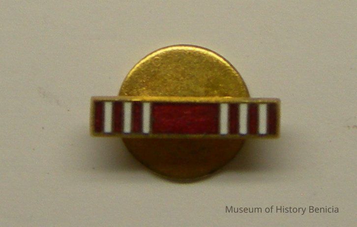 it fits into a lapel button-hole; red with white stripes; front: 5/8" x 1/8", back disk 1/2" diameter.