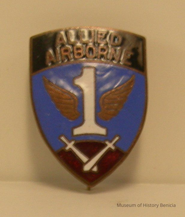 Pin - "Allied Airborne" pin-on, enameled metal shield shape; "Allied Airborne" at the top, a white "1" with gold wings in the center and crossed white swords on a red background at the bottom;