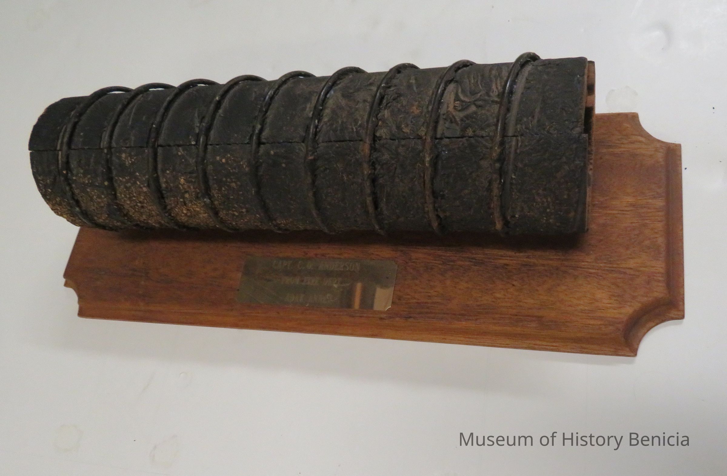 This is a wood pipe attached to a wood frame with a gold label that reads, "Capt. C. O. Anderson from Fire Dept., Adak Annex.