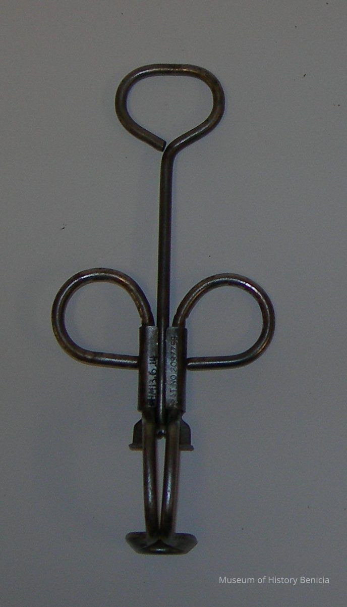 Metal cherry pitter, thump and finger loops with rod to push pit through and out of the cherry on frame" Pat. No. 2097756