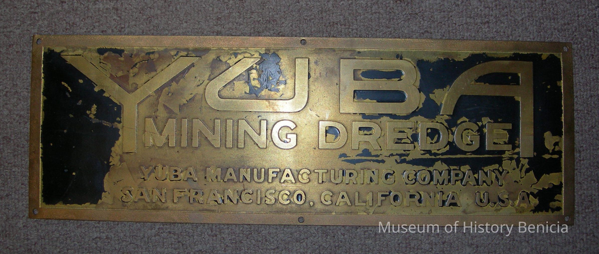 Brass plaque "YUBA MINING DREDGE Yuba Manufacturing Company San Francisco, California U.S.A." Place of origin unknown