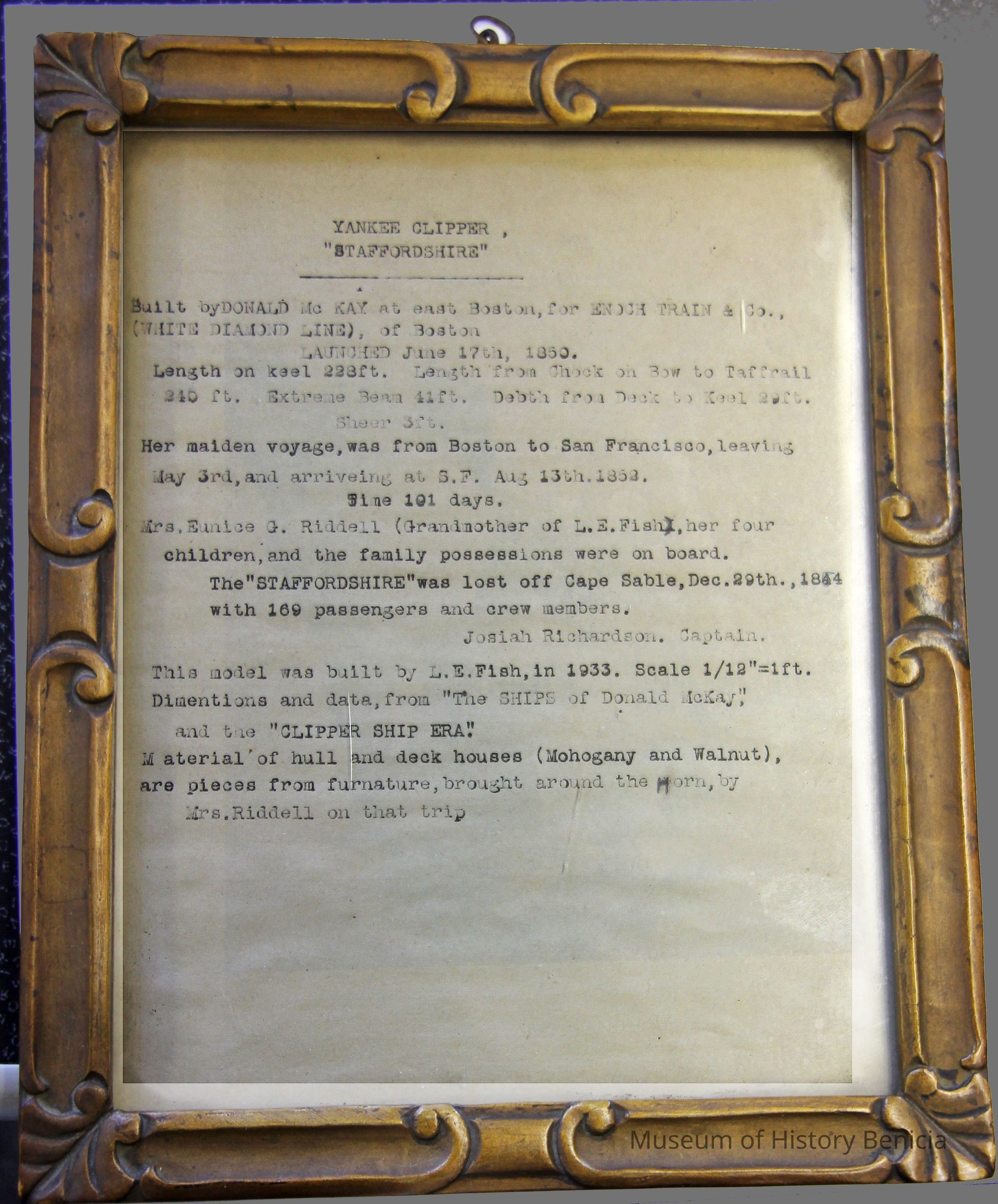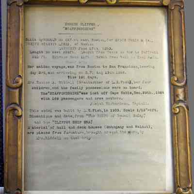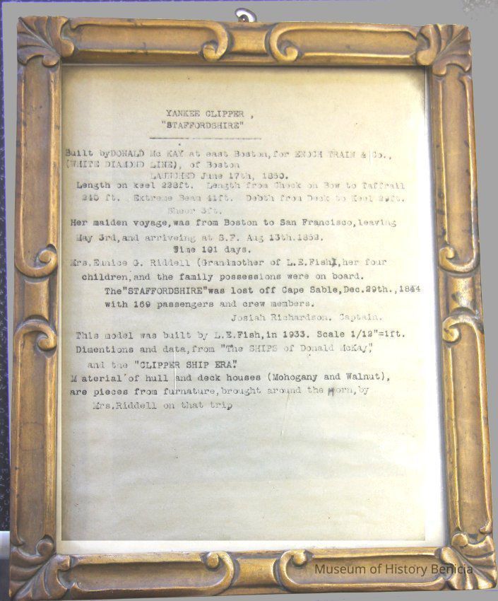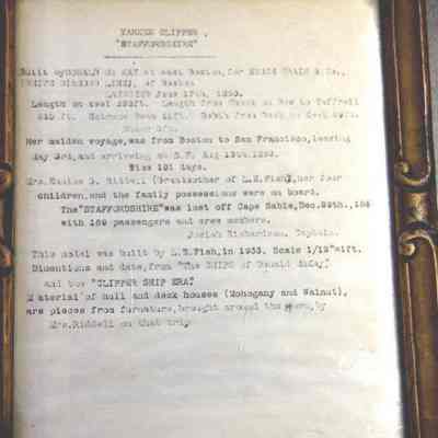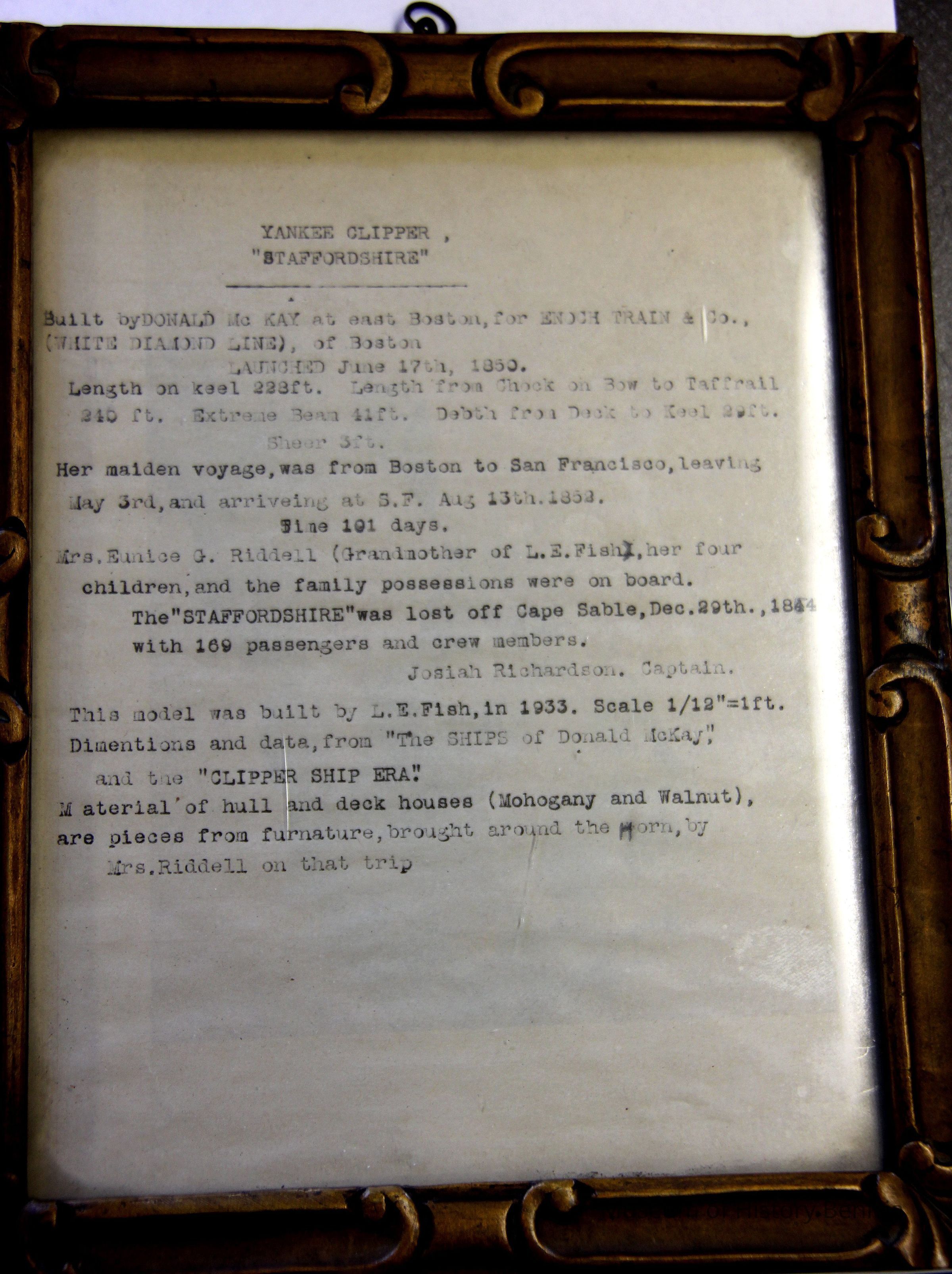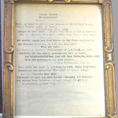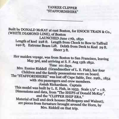 Description of the ship model of the Clipper Ship "Staffordshire". The write-up was done by Lawrence Fish and this is a verbatum transcription done by Mr Pemberton. It is framed.Collection