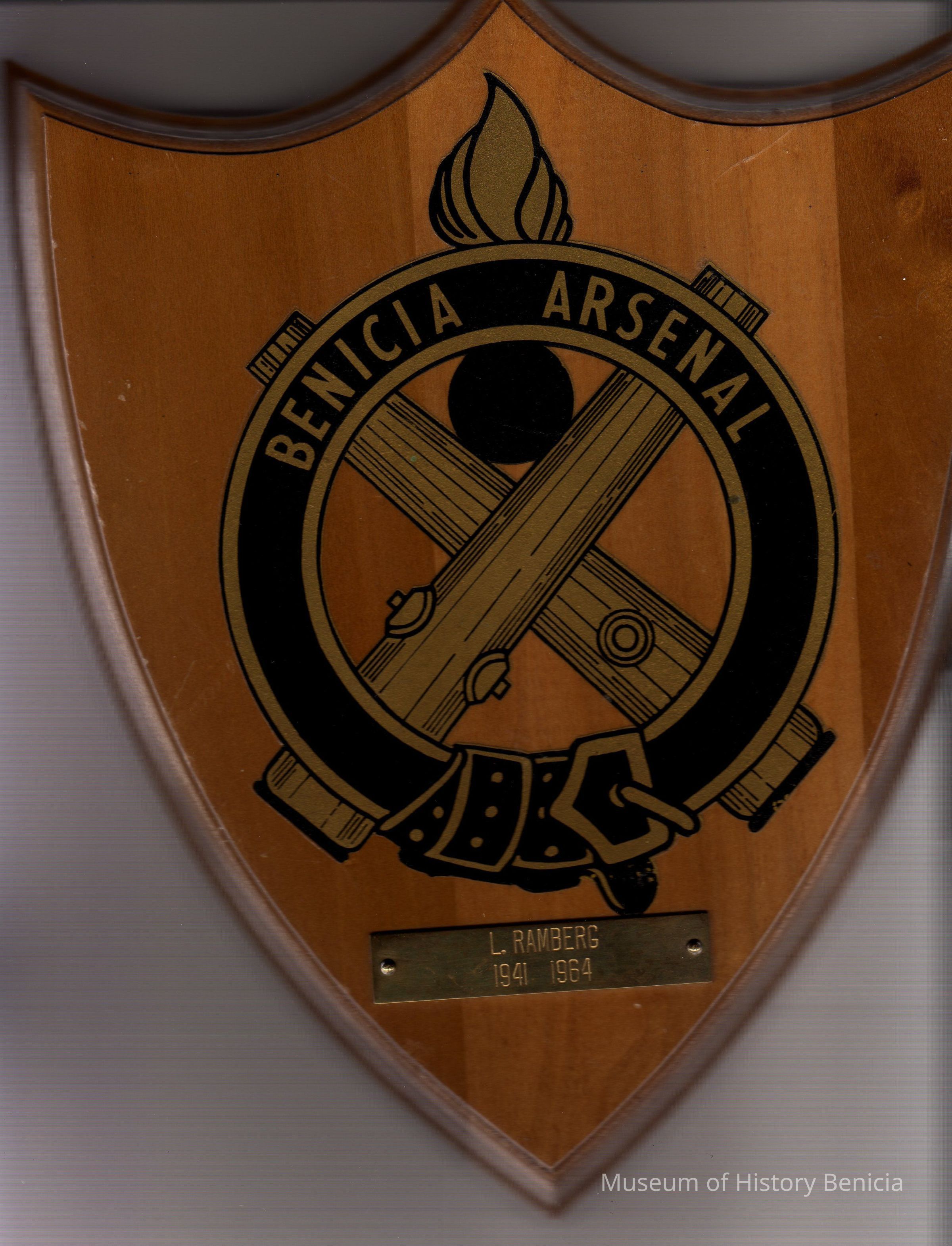 crest-shaped plaque, light brown wood, gold and black decal Benicia Arsenal logo for ordnance, given to Leonard Ramberg to commemorate his years of service at Benicia Arsenal from 1941 through 1964. Brass plate (5/8" x 3") engraved "L. Ramberg 1941 1964"Collection
