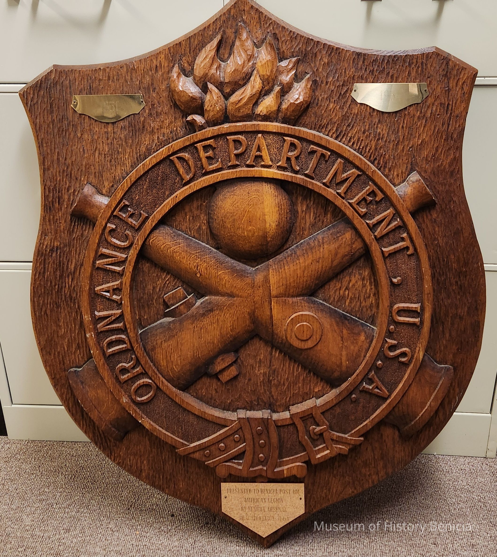 Large carved wooden plaque: ordnance symbol and crossed cannons with raised lettering in a circle "Ordnance Department, U.S.A."