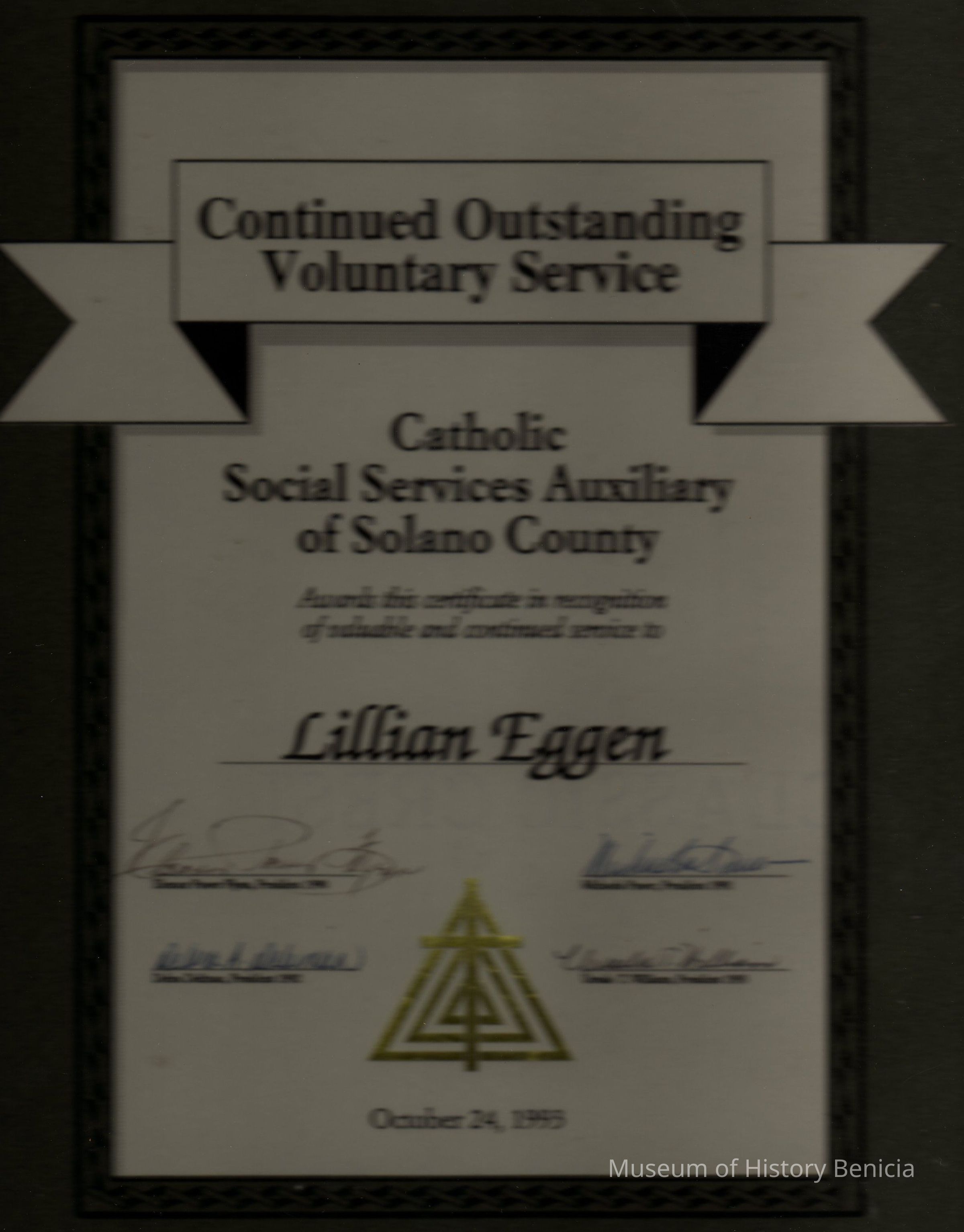 Includes signatures for four presidents of the Catholic Social Services Auxiliary. Issued October 24, 1993. Paper on matte in glass photo frame.Collection