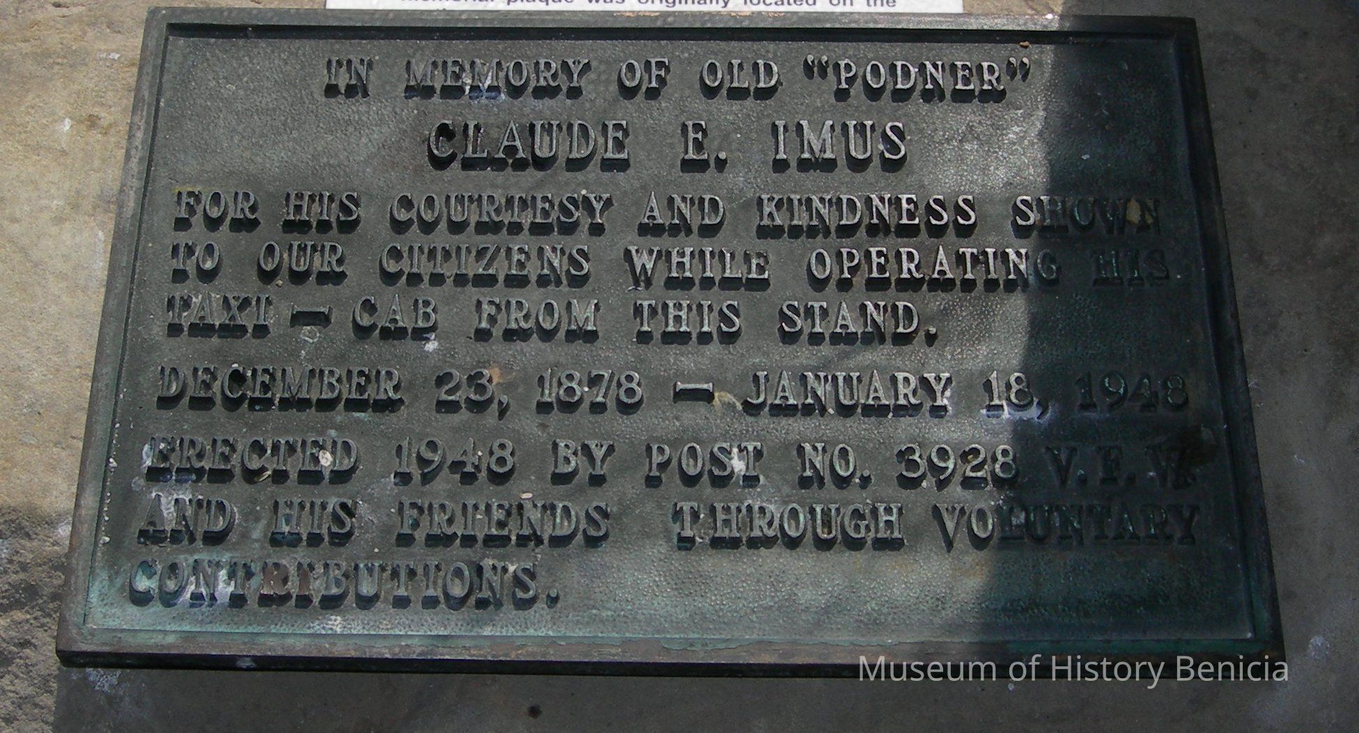 and dedicated to the memory of "Podner" Mr. Claude E. Imus for courtesy and kindness shown to citizens while operating his taxi-cab from this stand; erected in 1948 with contributions from his friends.Collection