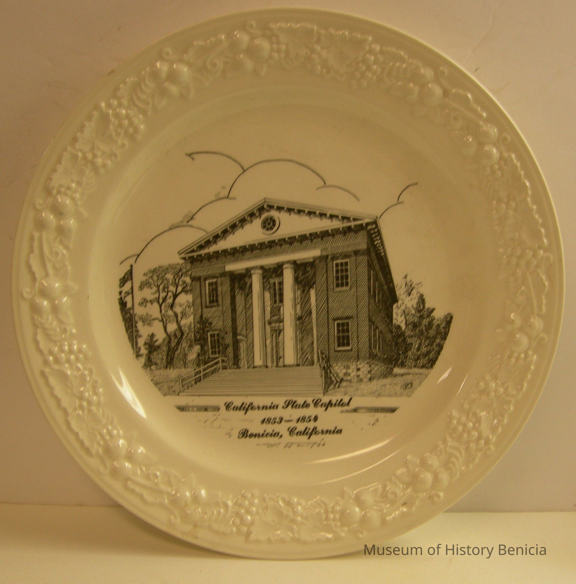 Souvenir Plate - white with black lithodgraph of the Benicia State Capitol Building: "California State Capitol / 1853 - 1854 / Benicia, California" 10" diameter