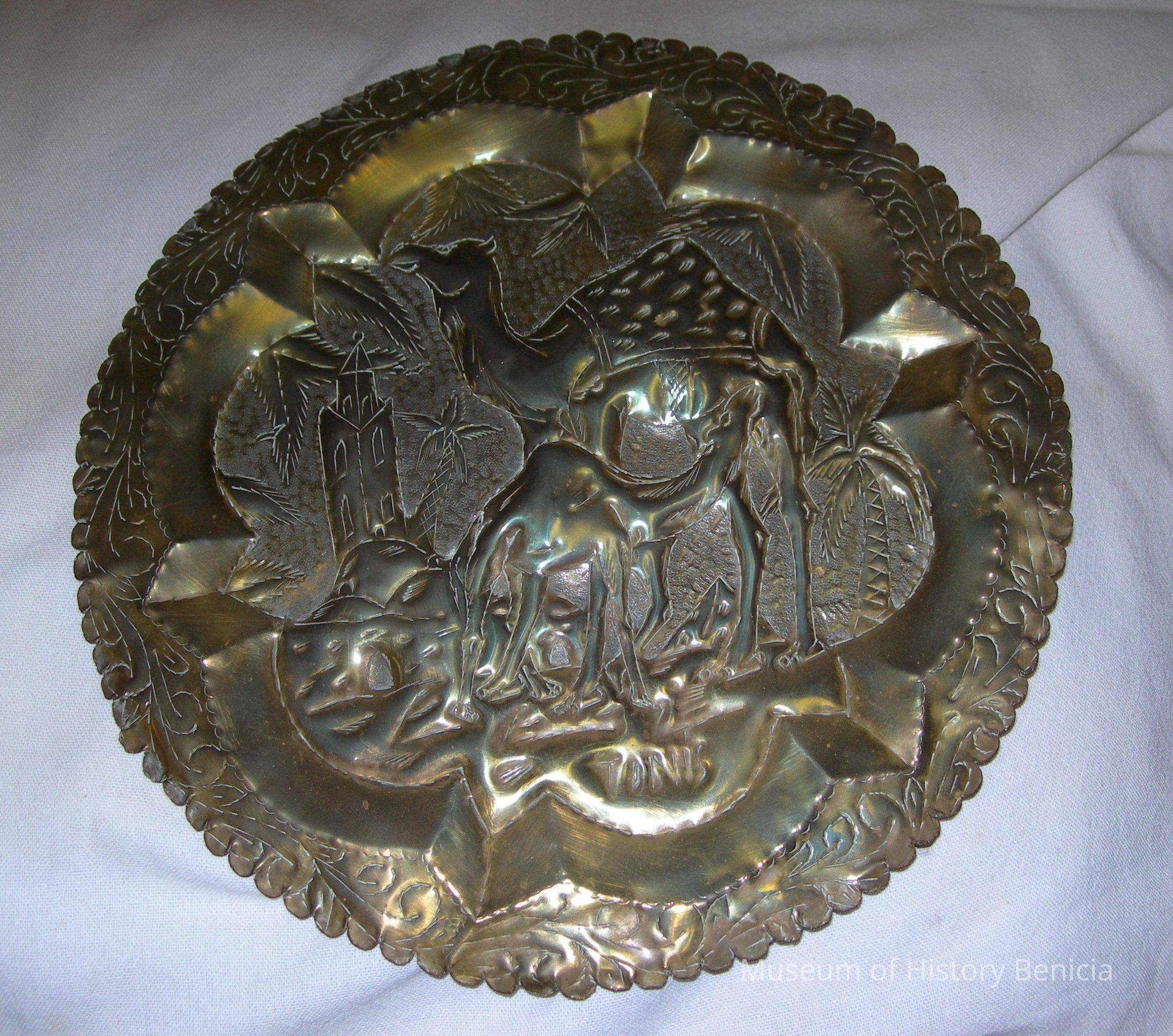 Brass plate with two camels embossed (hammered style) on it. There is a mother camel with a baby suckling. "Tunis" is etched on below the camels. A mineret is in the background. The edge is scalloped.Collection