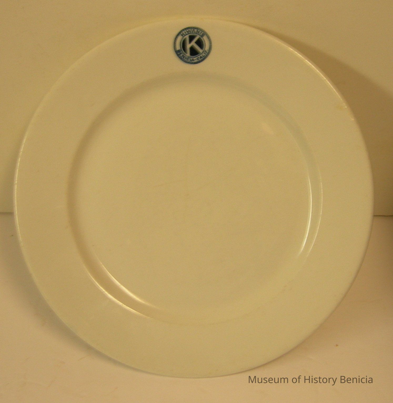 White plate with blue Kiwanis, Benicia - Calif. logo; 9-3/4" diameter