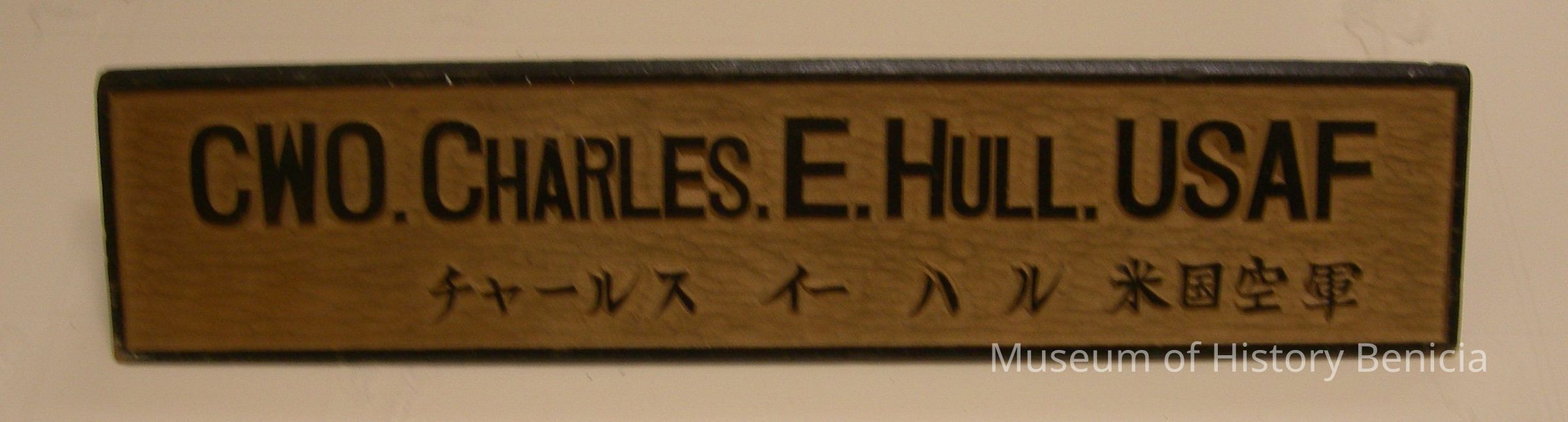 Desk name plate - trianglular "CWO. Charles. E. Hull. USAF" above oriental characters which spell out his name and rank. Black on tan front, black on all other sides;