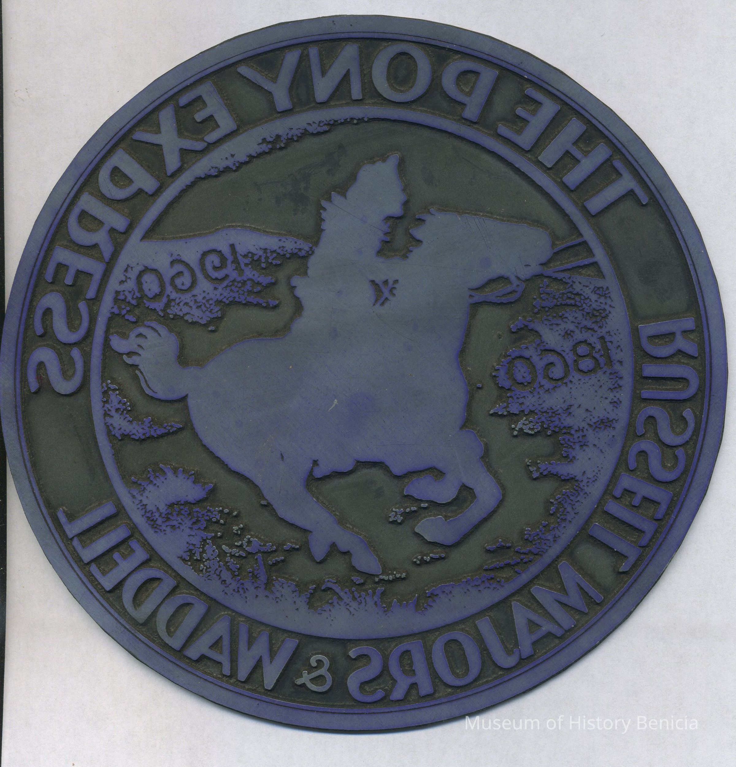 Offset, printing plate: 6" diameter - "The Pony Express / Russell Majors & Waddell" "1860 - 1960" with a rider on a galloping horse.