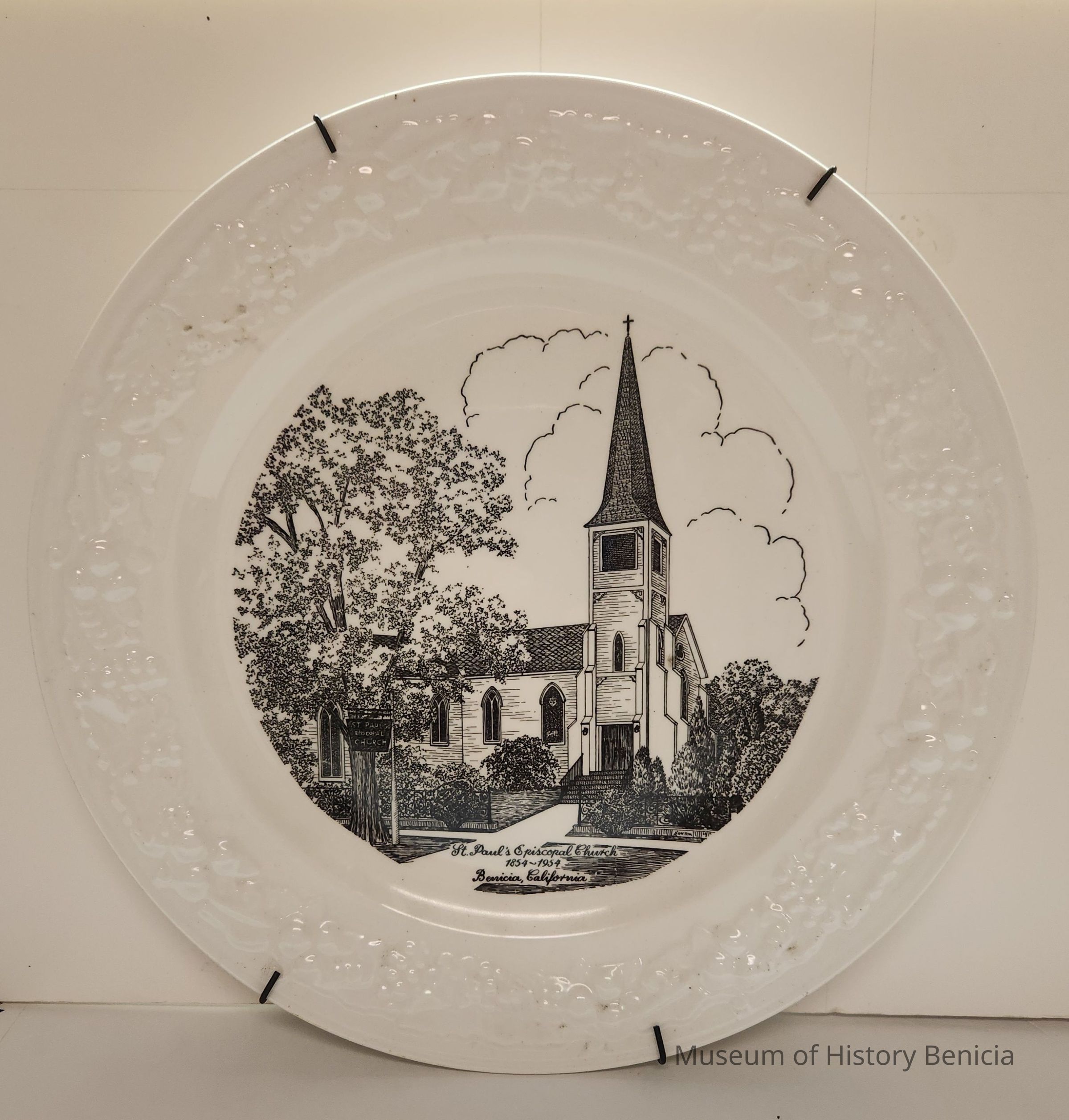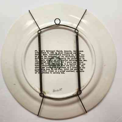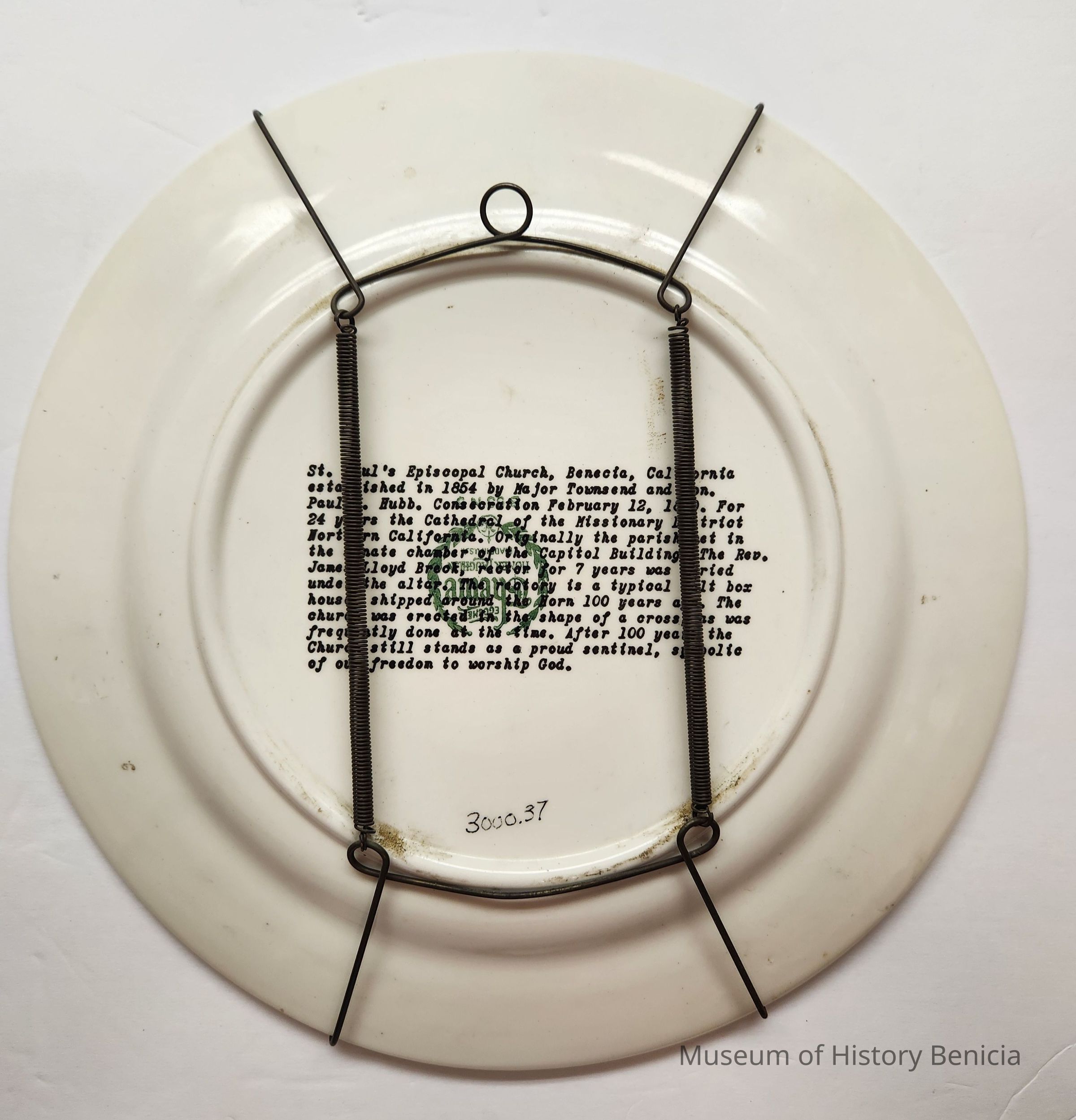 Souvenir plate with a lithograph of St. Paul's Episcopal Church 1854-1954, Benicia, California. It is a Homer Laughlin Eggshell Theme Plate. On the back is a short history of the church (where Benicia is spelled Benecia) along with the green Homer Laughlin maker's mark.