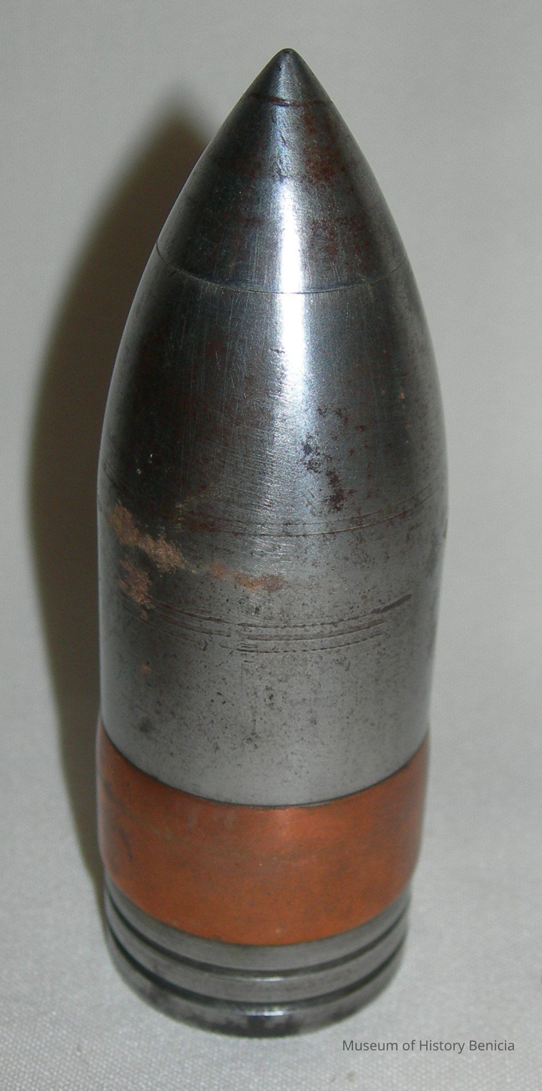 Metal projectile, cylindrical, pointed at one end; copper-colored band and grooves in other end. Hole in end circled by imprinted writing: "The Toledo Screw Products Co."