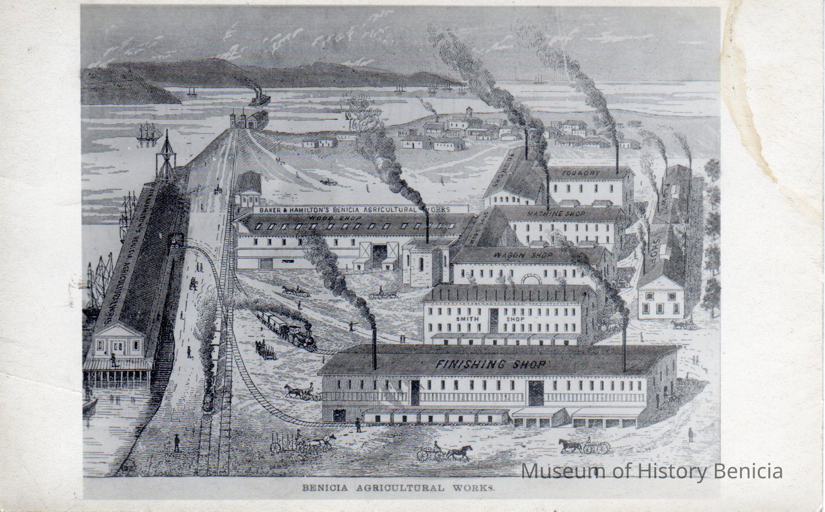 B/W postcard of a sketch of Benicia Agricultural Works.