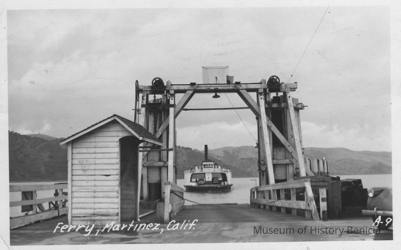 B/W reprint of photo postcard, mailed Oct. 7, 1953, signed by Fred M. Wold, Capt and John J. Cocco, 1st Mate, with report of "5:40 pm, weather dry and calm". Mailed to Lockwood, 1135 Ulfinian Way, Martinez, CA. Photo shows ferry coming into Martinez.Collection
