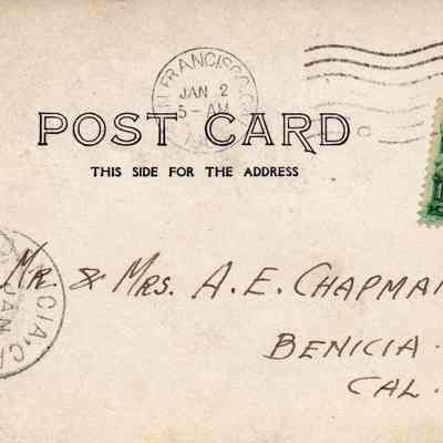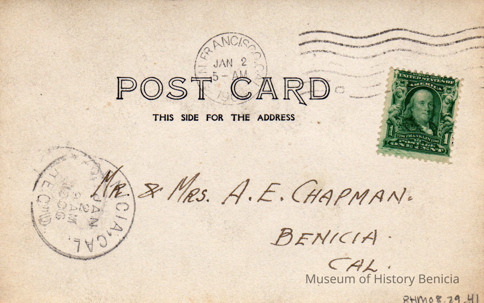 B/W postcard addressed to Mr. and Mrs. A. E. Chapman, Benicia, CAL dated January 2, 1906