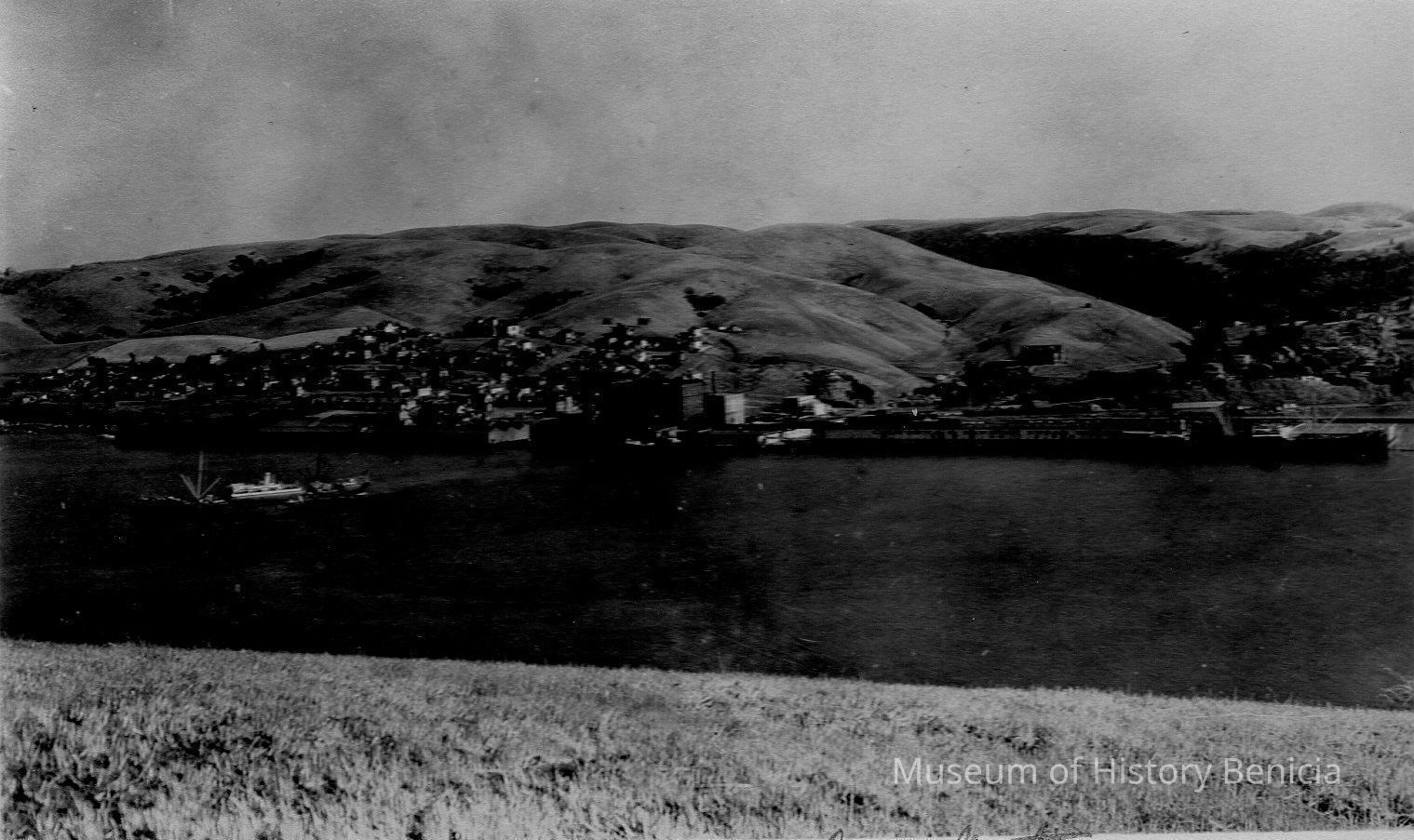 B/W postcard of Crockett (at left) and Valona (at right) with C & H Sugar Refinery between them (center). View is looking south across strait from Vallejo. It was taken prior to the building of the first Carquinez bridgeCollection