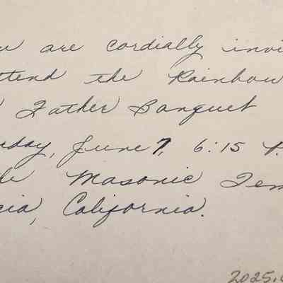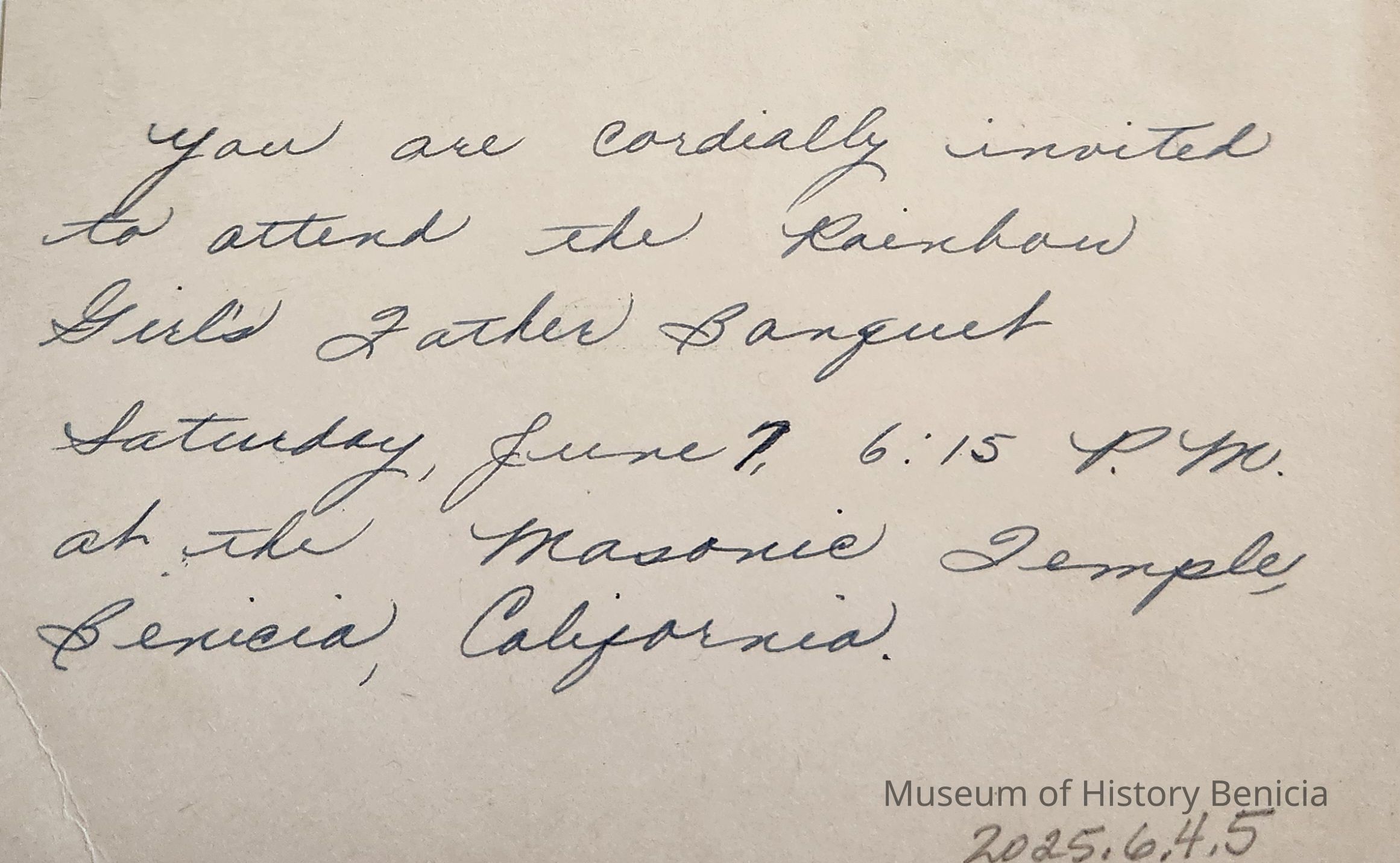 Second side: "You are cordially invited to attend the Rainbow Girls' Father Banquet Saturday, June 7, 6:15 P.M. at the Masonic Temple, Benicia, California" , hand written in dark blue ink.Collection