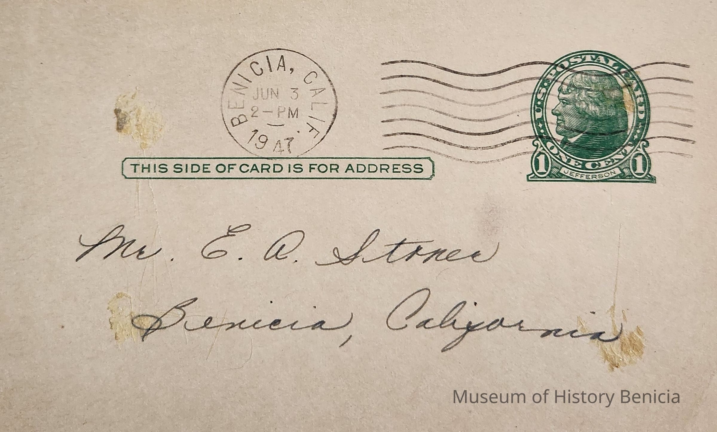 One side: one cent stamp printed on card, postmarked Benicia Calif / June 3, 2-PM, 1947 / Mr. E.A. Stoner / Benicia, California