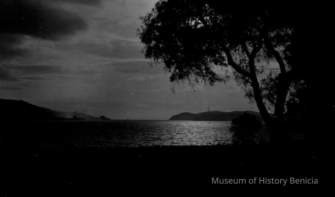 B/W postcard of Carquinez Strait looking west toward Crockett before the Carquinez Bridge was built. This is a duplicate match to BHM01.9.12.Collection