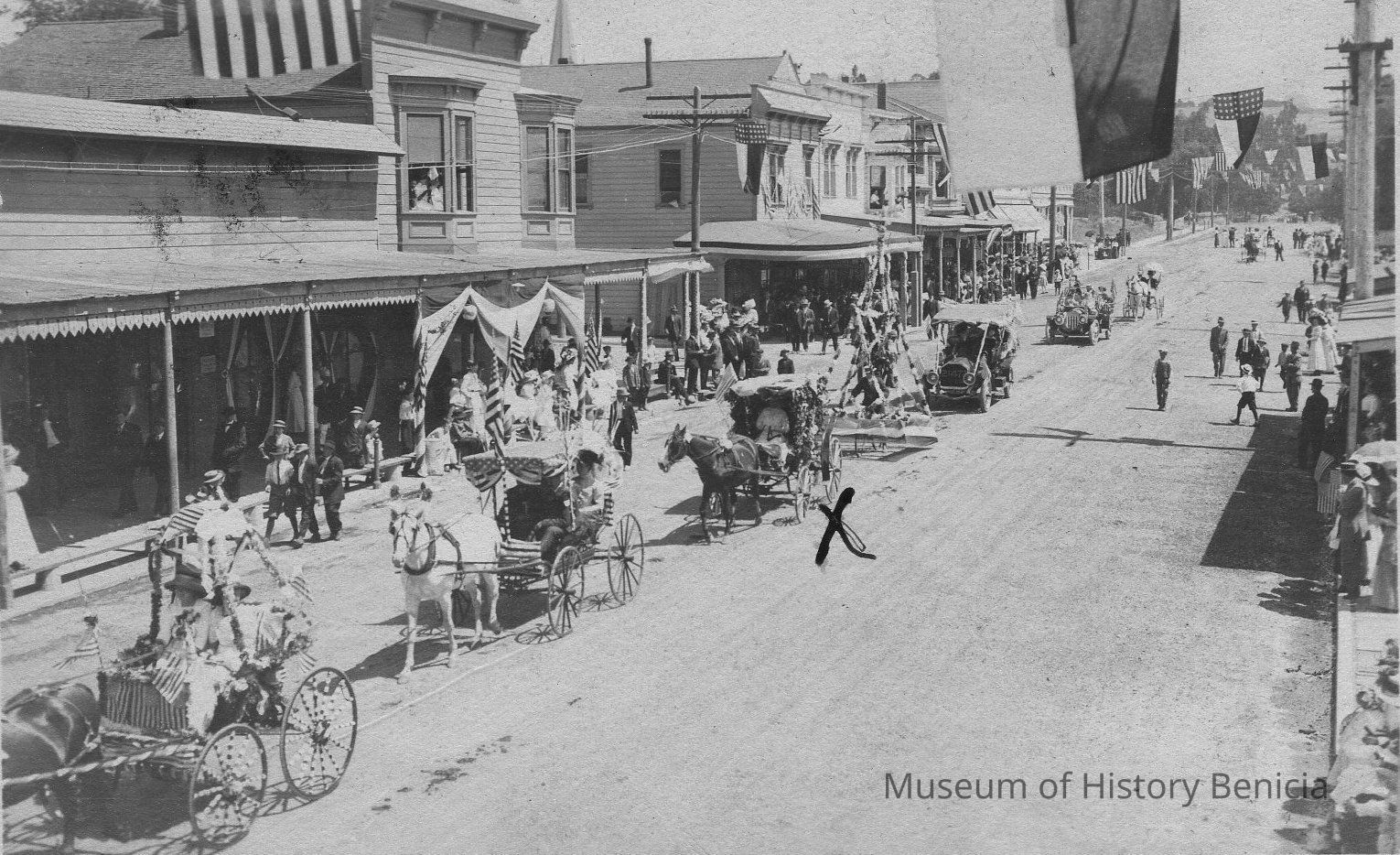 Written on the back: This is the view of the 4th of July parade, the one with an X is [unreadable]. This picture was taken before 1910 because of the wooden awnings in front of the business/houses - Steve [unreadable]Collection
