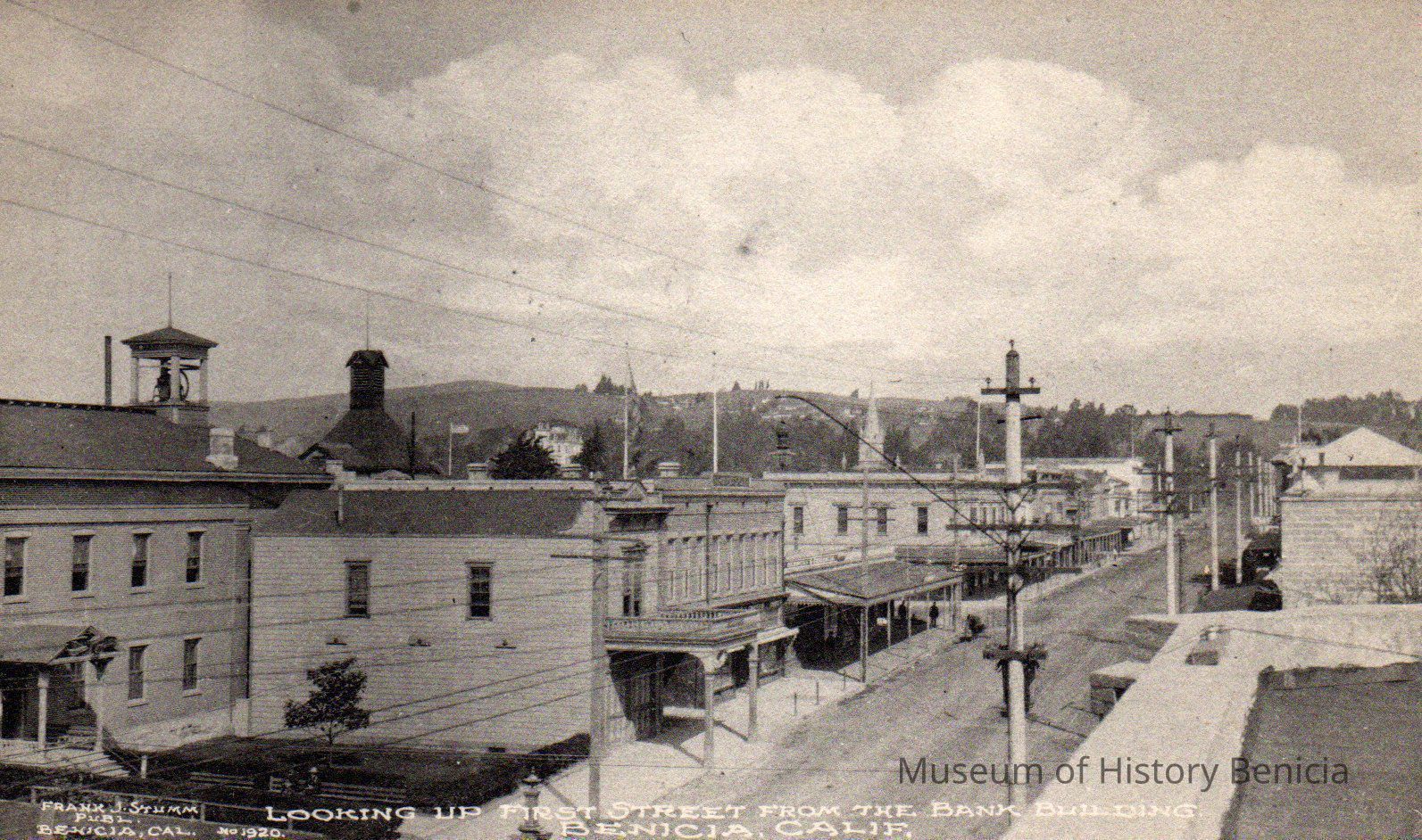 B/W image taken by Frank J. Stumm. Looking up First Street from the Bank Building Benicia, Calif. (SE corner of First and G Streets)
