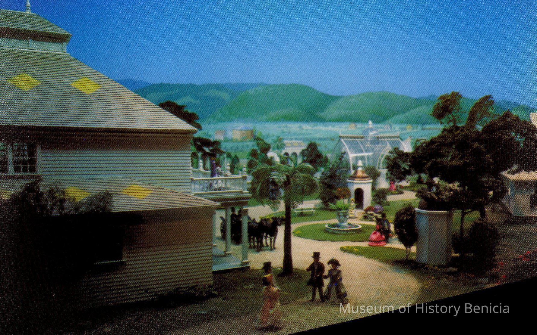 Caption on back: One end of the 32' long diorama recreating Sam Brannan's famous Hot Springs Resort of the 1860's-1870's. Buildings and figures created by Ruth and Robert Durbin. Background by A. Kendall O'Connor. Featured in the Sharpsteen Museum.