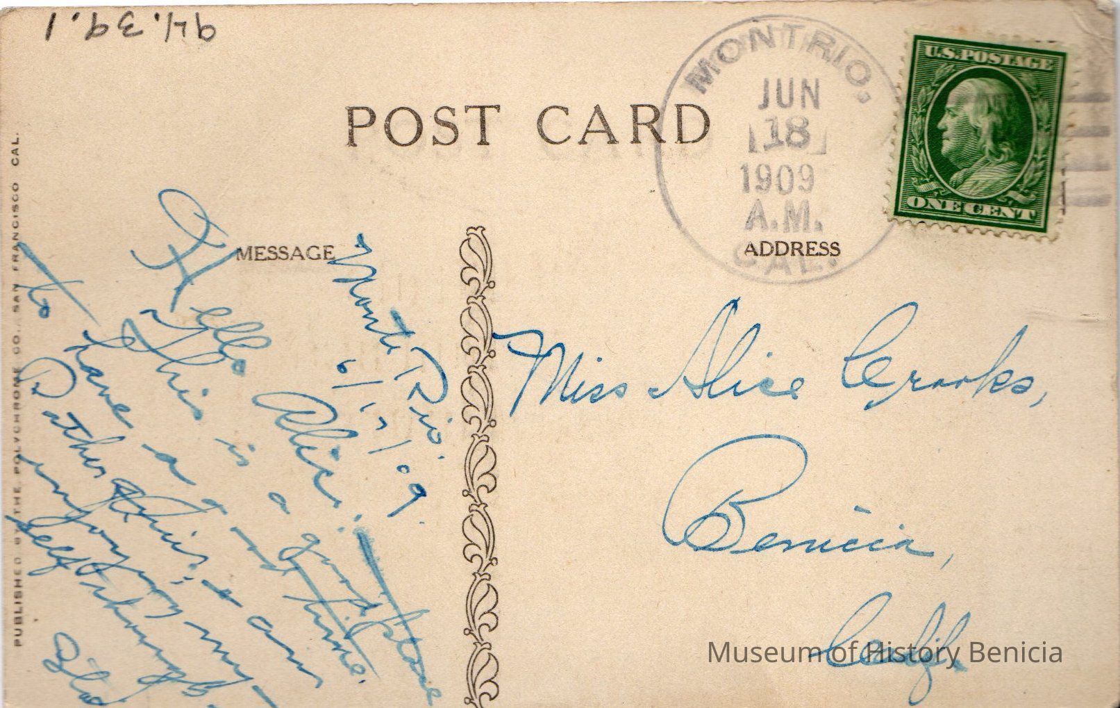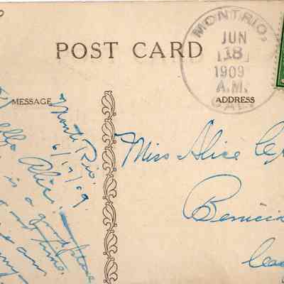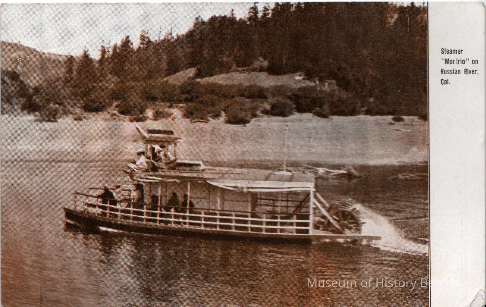 Postcard with picture of steamer "Mon trio" on the Russian River, Cal. Addressed to Miss Alice Crooks.