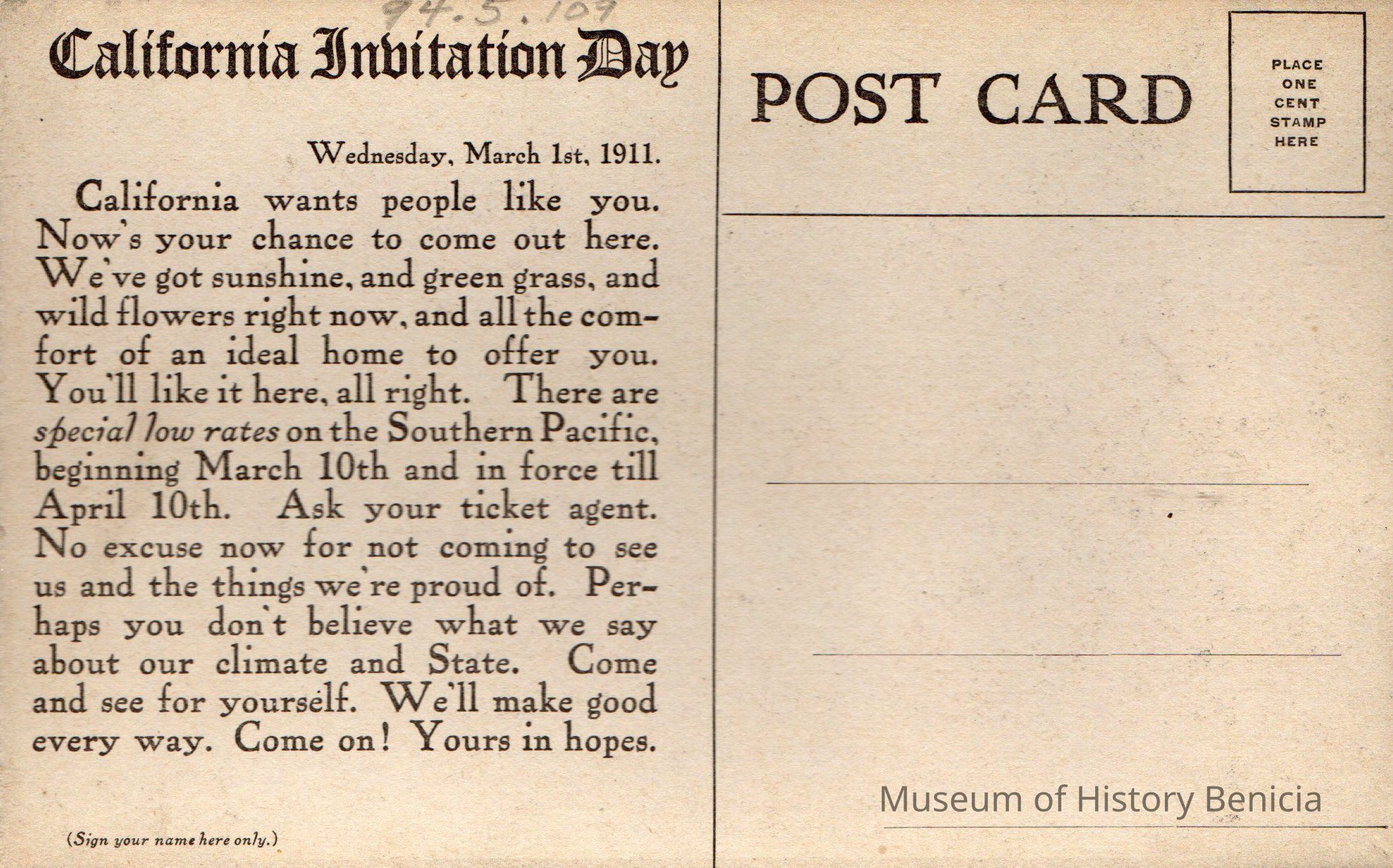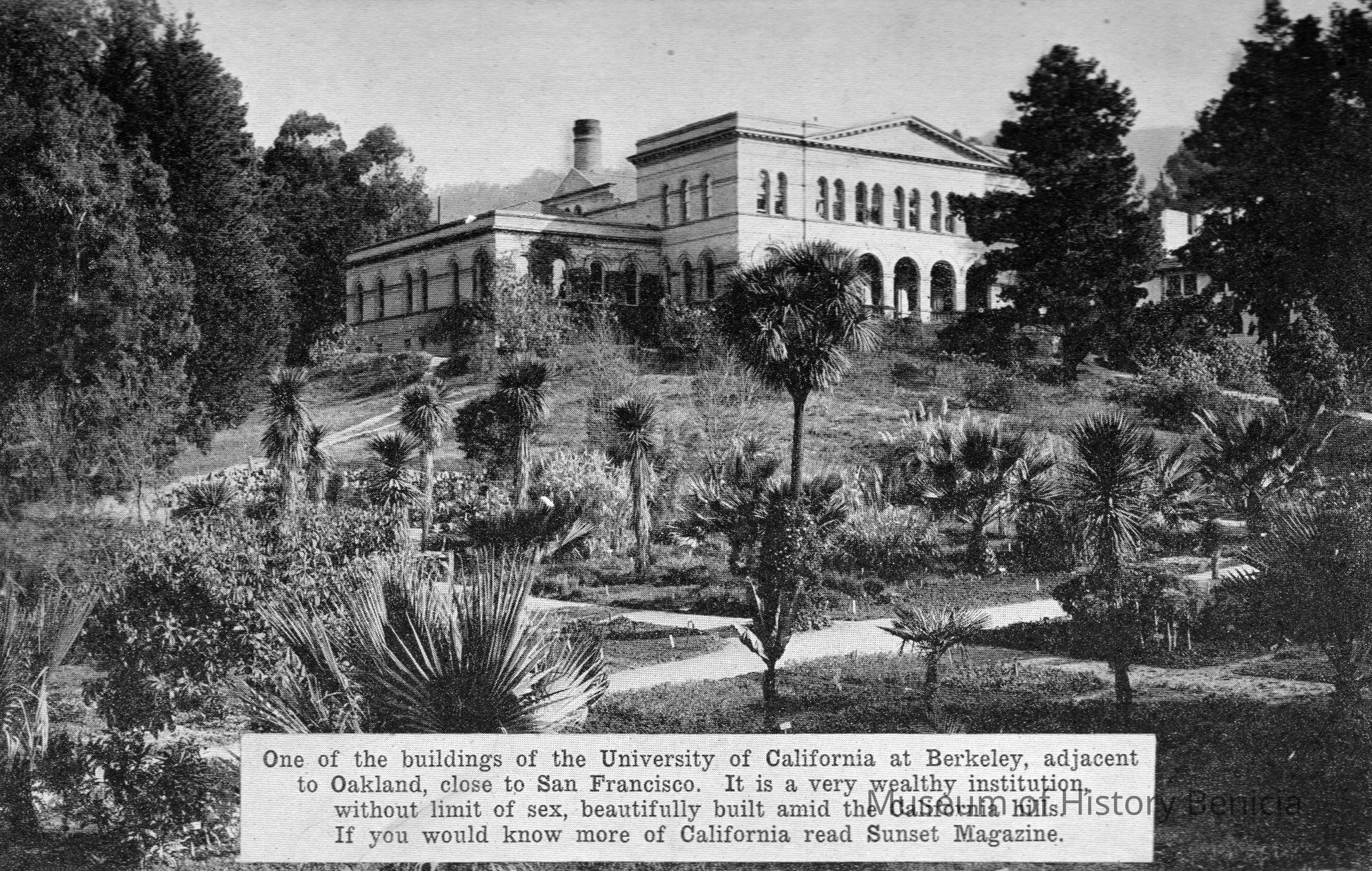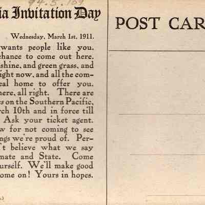 One of the buildings of the U. of California, Berkeley. Card is entitled California Invitation Day, dated March 1, 1911
