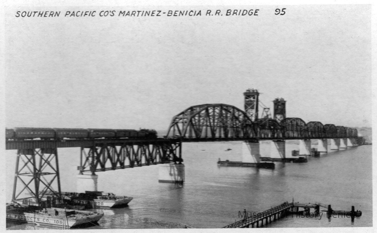 B/W View of Southern Pacific Company's Martinez-Benicia Railroad Bridge. Taken from Benicia side, with passenger train at left and two barges.