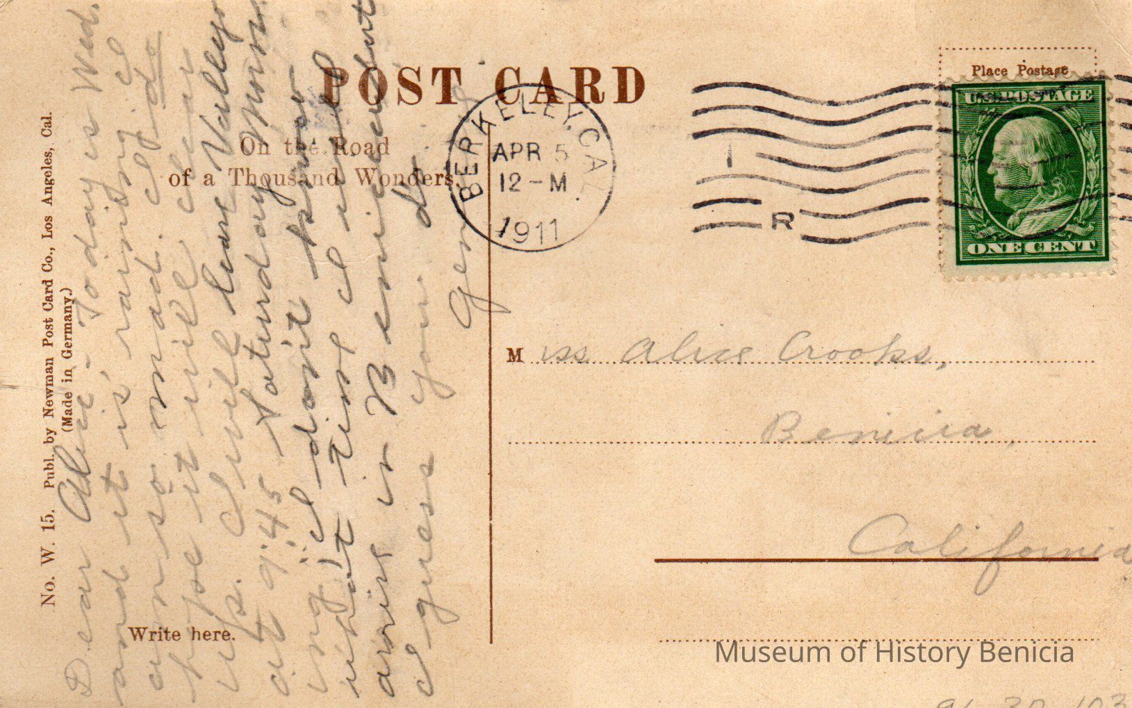 Faculty Club University of California, Berkeley. Addressed to Miss Alice Crooks and signed "General"