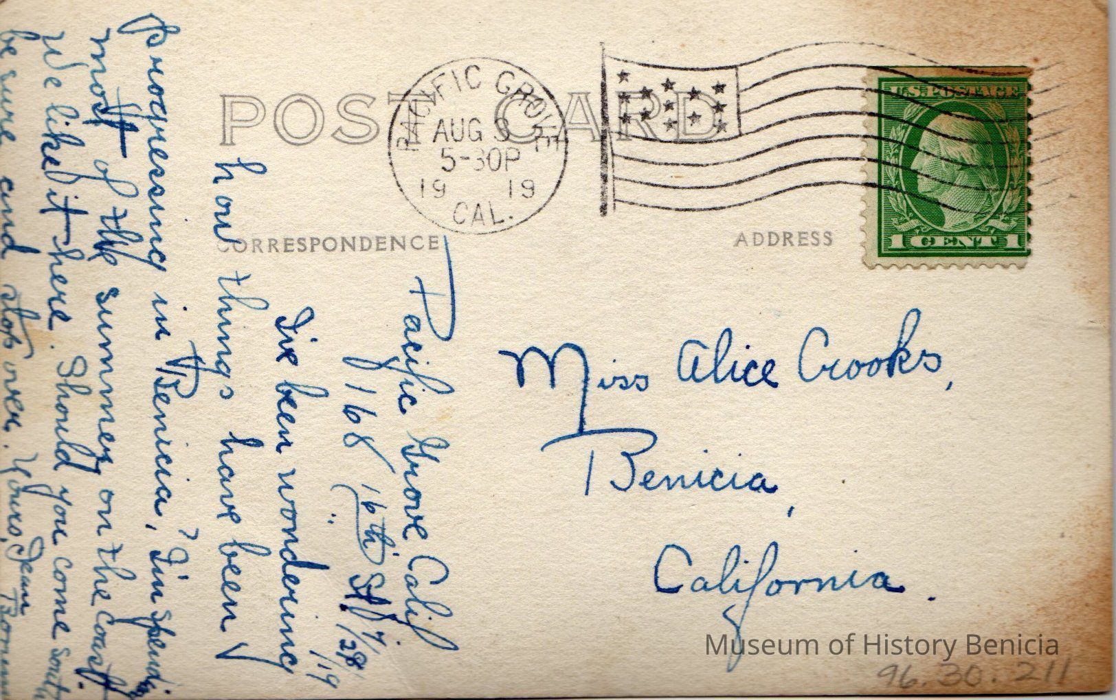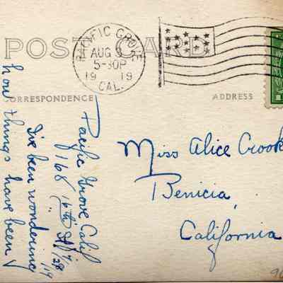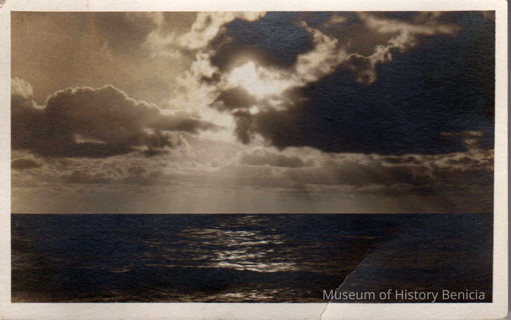 Sun shining through clouds over ocean. Addressed to Alice Crooks from Jean Bonum.