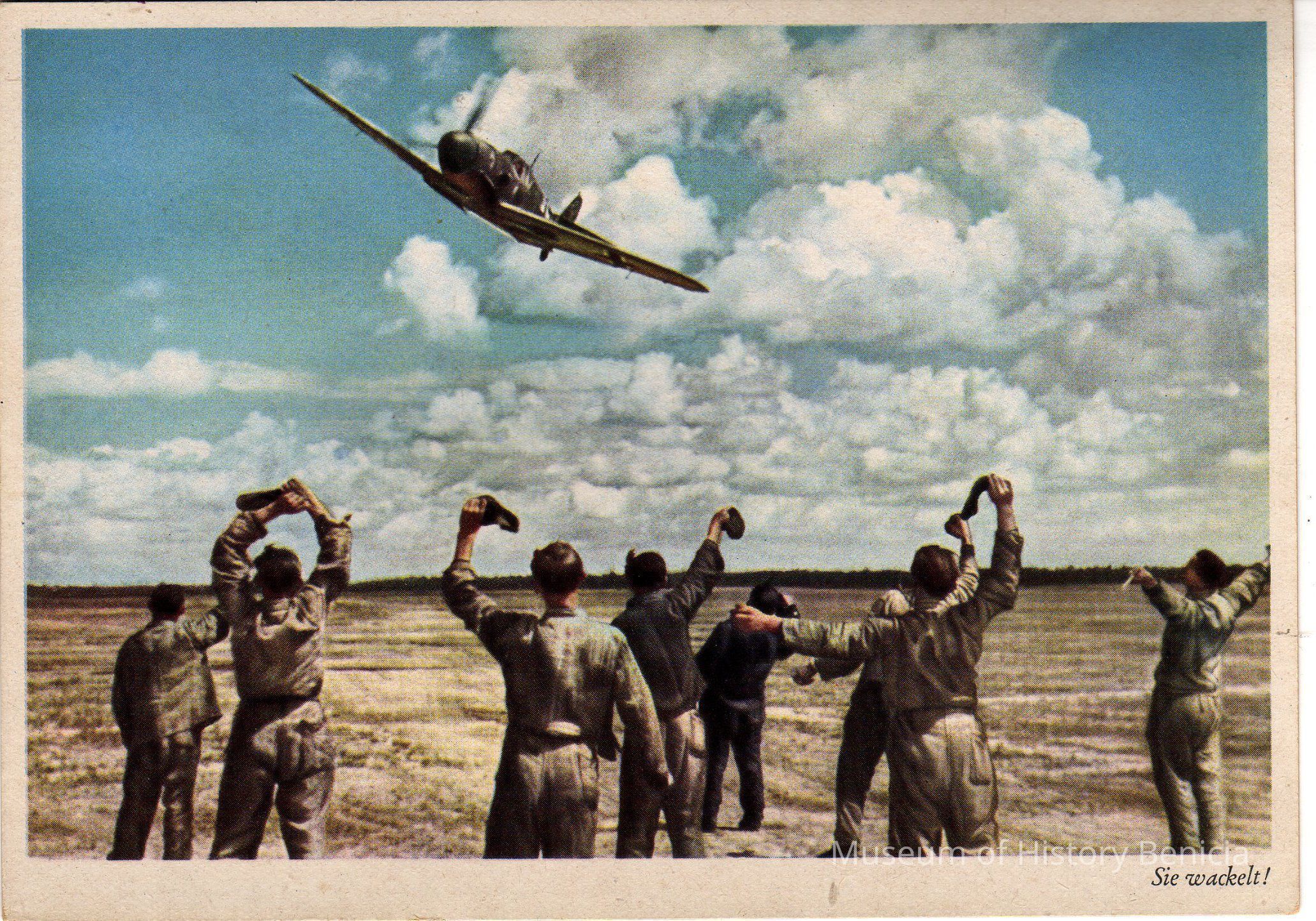 photo: Eight men on ground waving to Me 109 plane overheadCollection