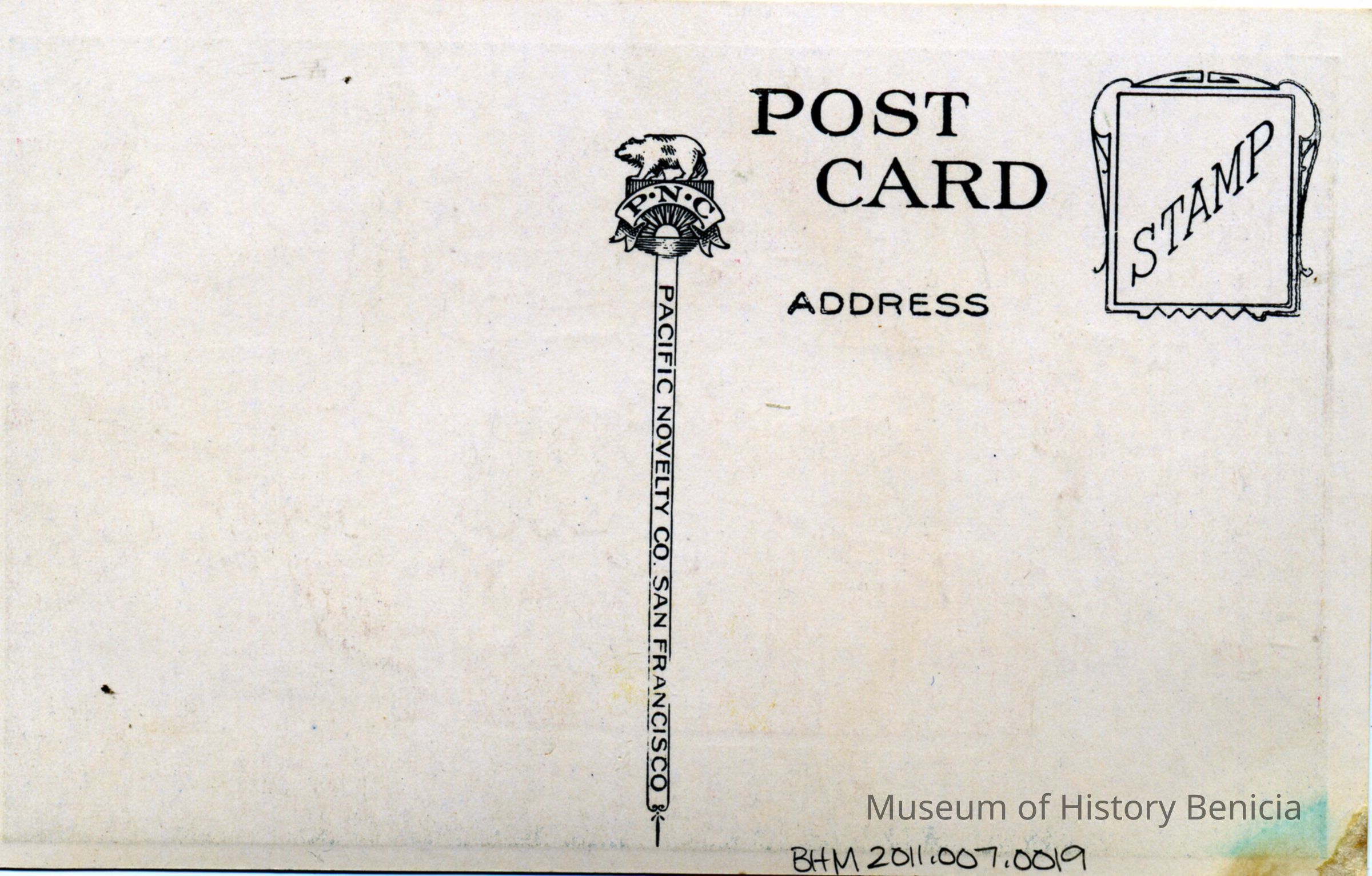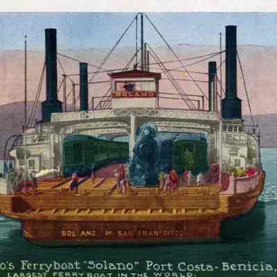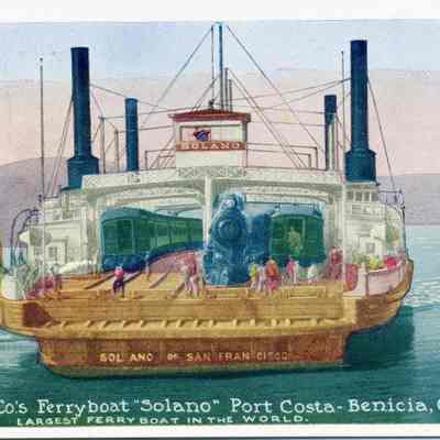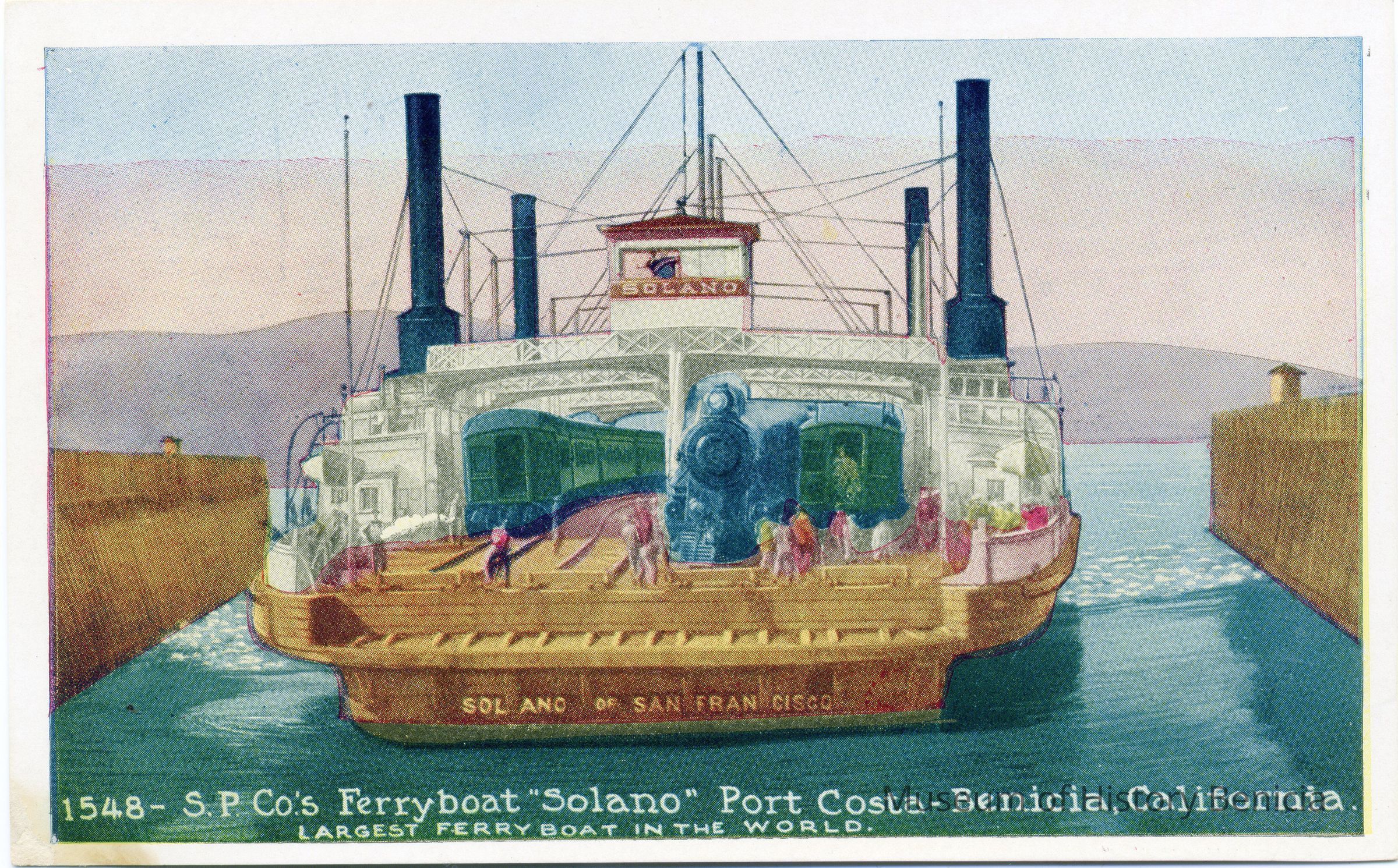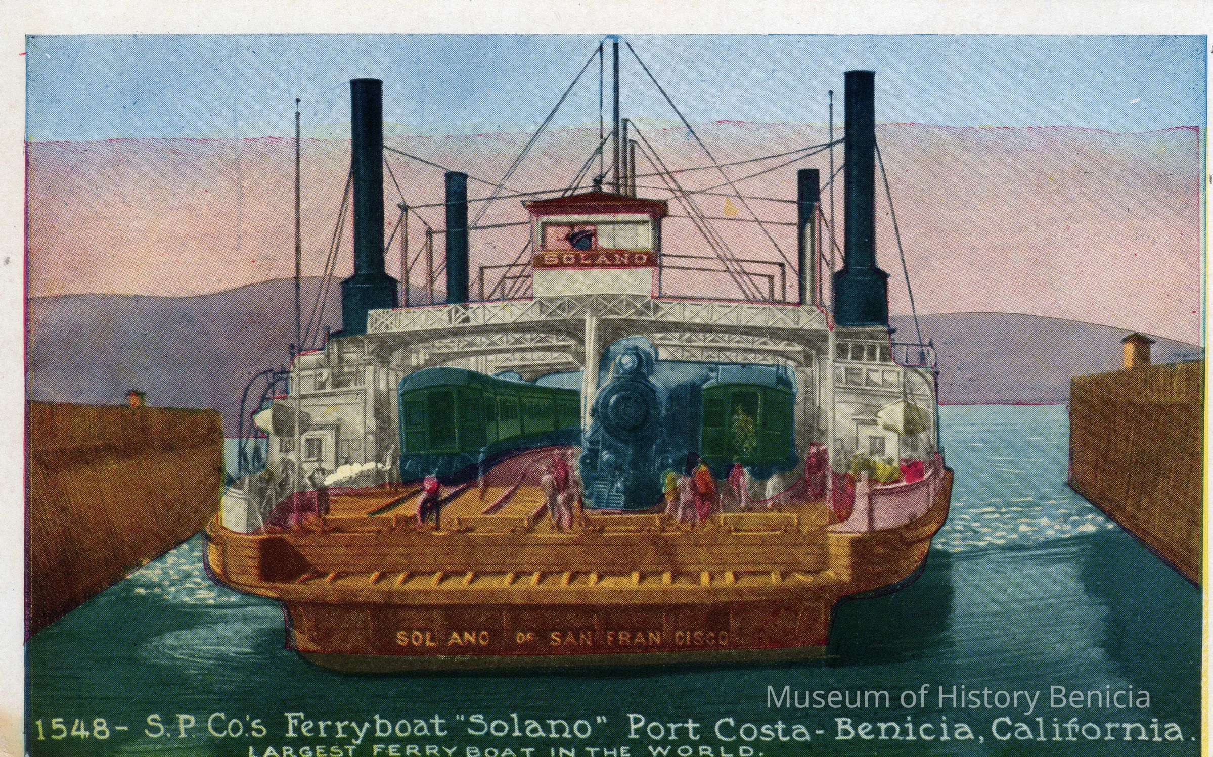 Blank postcard of the Solano Ferry. Reads, "1548 - S.P. Co's Ferryboat "Solano" Port Costa - Benicia, CA." Next line: "Largest ferryboat in the world." Postcard published by the Pacific Novelty Co. San Francisco.Collection
