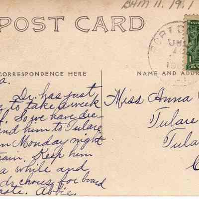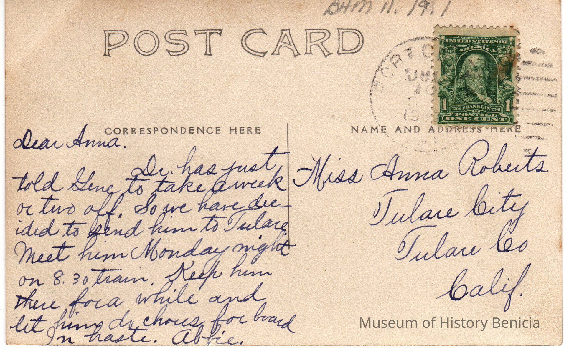 sent to Miss Anna Roberts in Tulare City, Tulare County Calif.