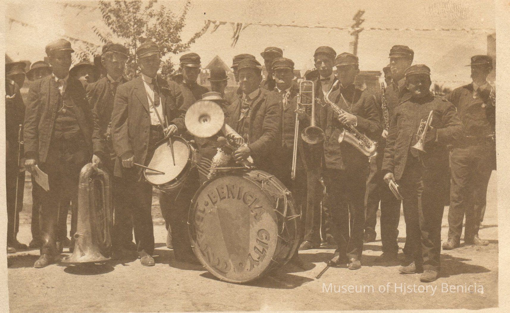 B/W postcard - photograph of Benicia City Band (as identified by name on drum)