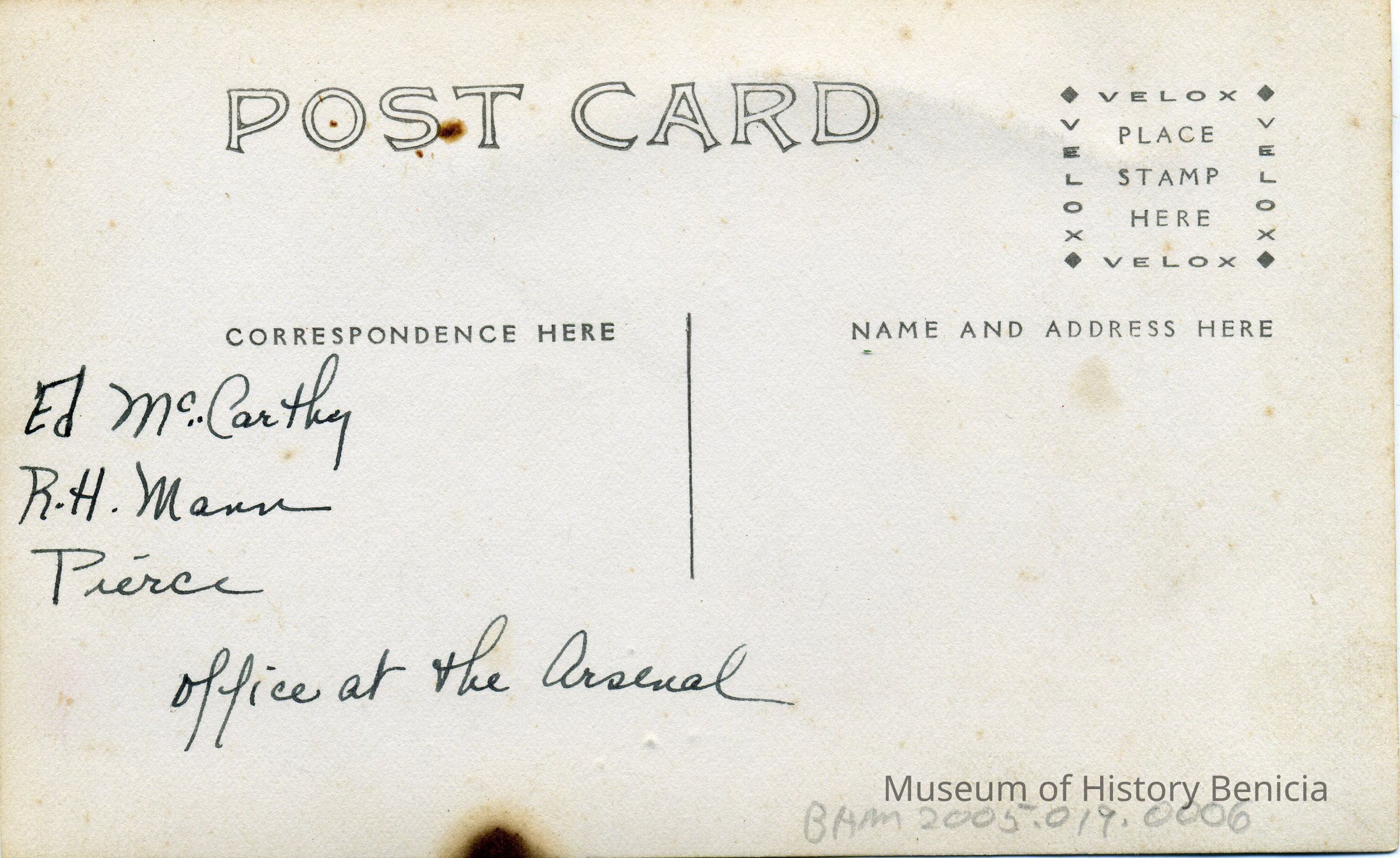 Postcard of an office in the Arsenal. The men are identified as Ed McCarthy, R.H. Mann, and Pierce.