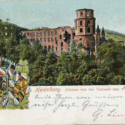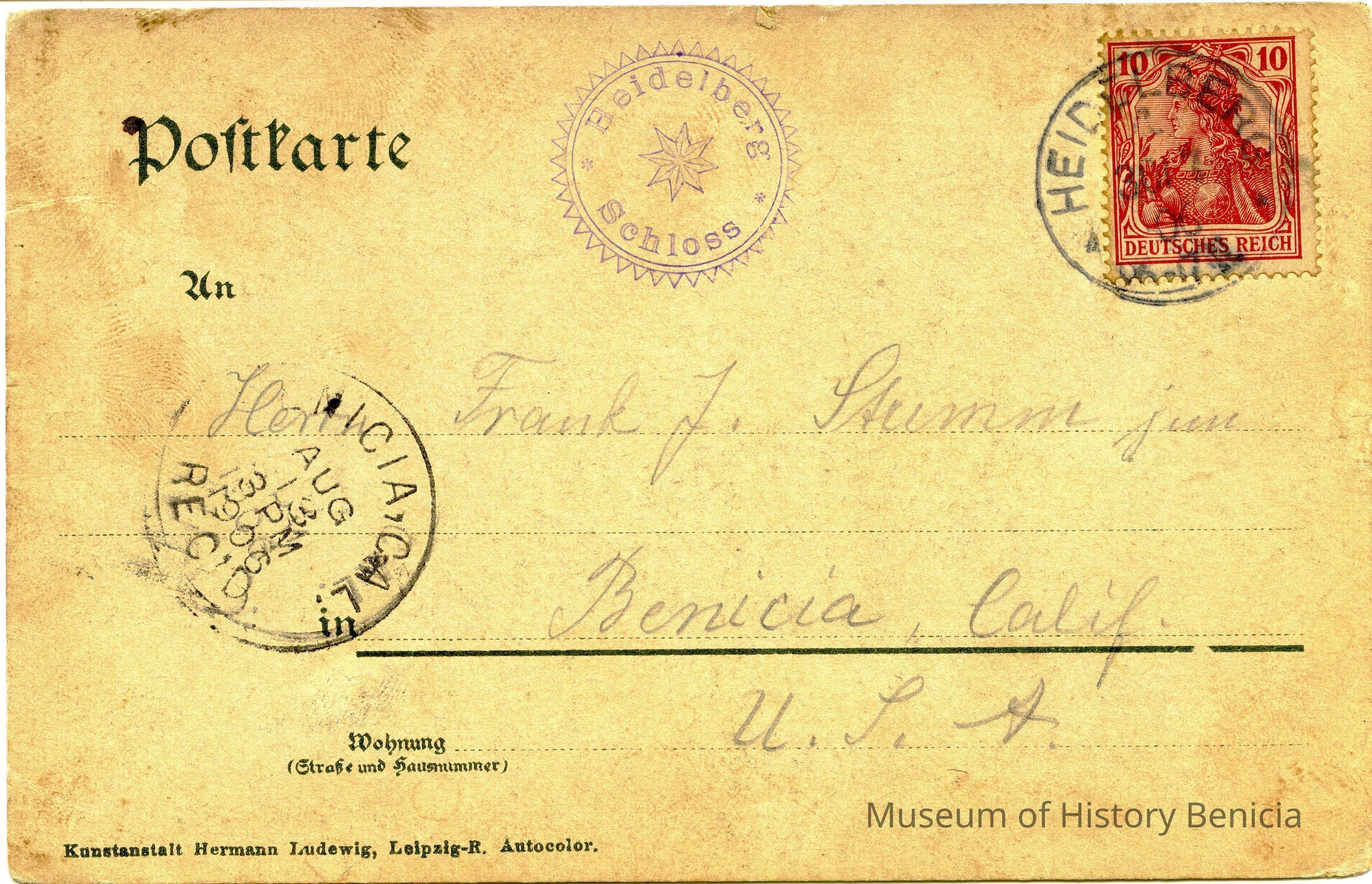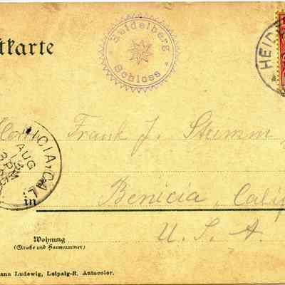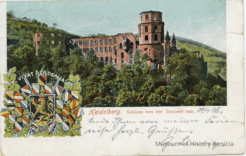 Postcard of Heidelberg in Germany. Dated July 30, 1906. It is from a G or Q Lindiery to Frank J Stumm in Benicia CA.