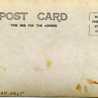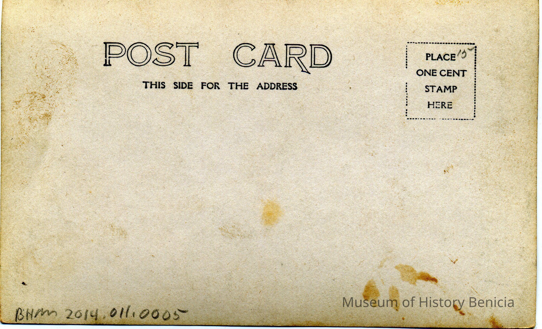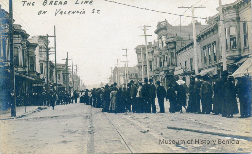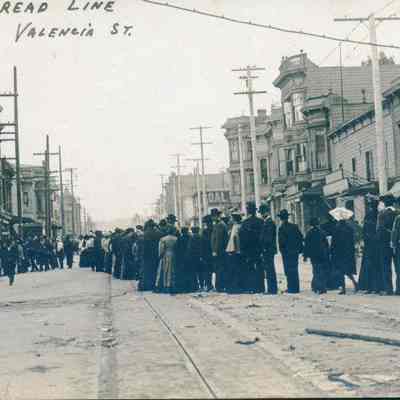 Postcard of bread line on Valencia St. in SF after the 1906 earthquake. It is an undivided back real-photo postcard. Stamp design is a plain.Collection