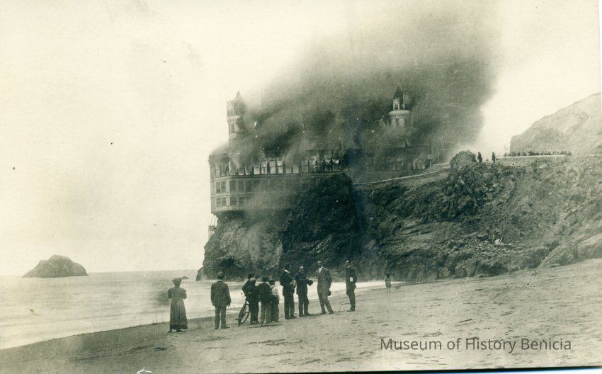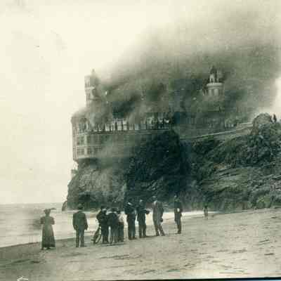 Postcard of people on the beach in San Francisco watching the Cliff House burn. This didn't happen during the SF 1906 Earthquake but a year after onSept. 7, 1907.Collection