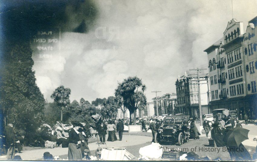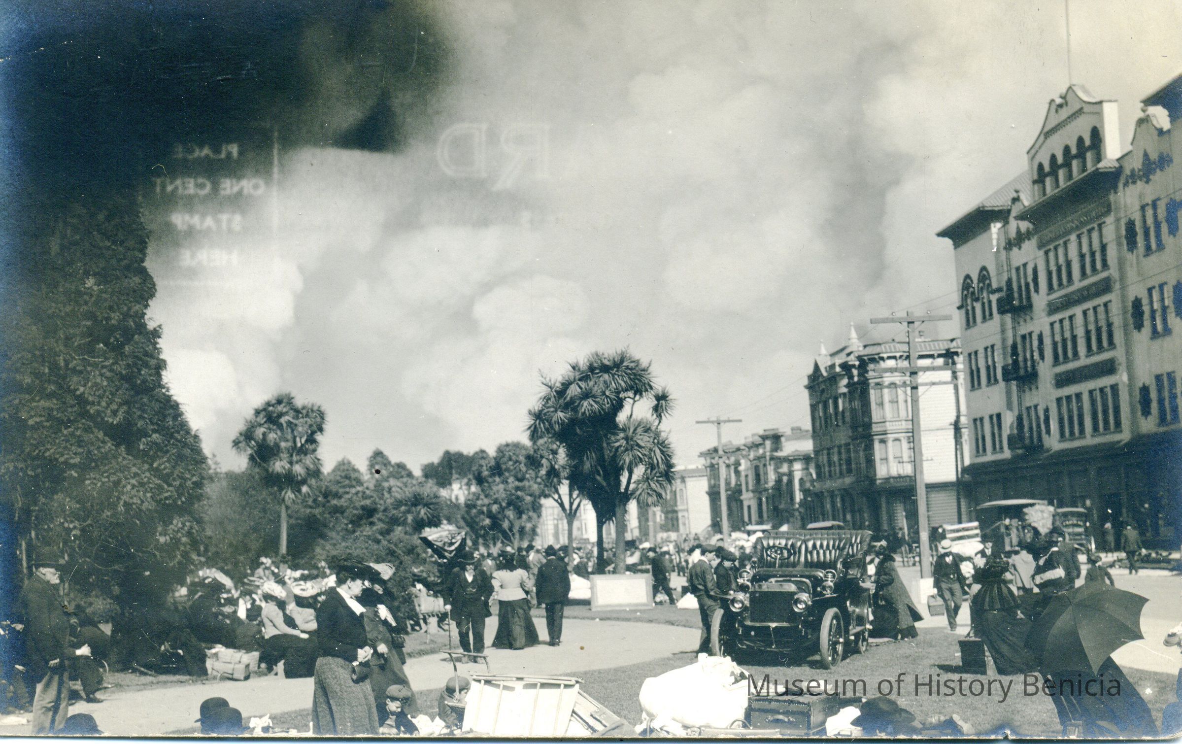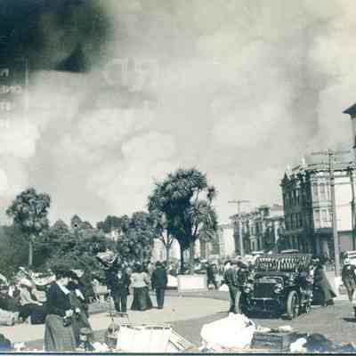 Postcard of people waiting near a park with their belongings and with buildings across the street and plumes of smoke in the distance.