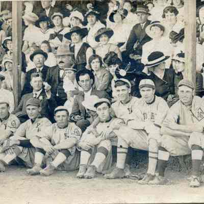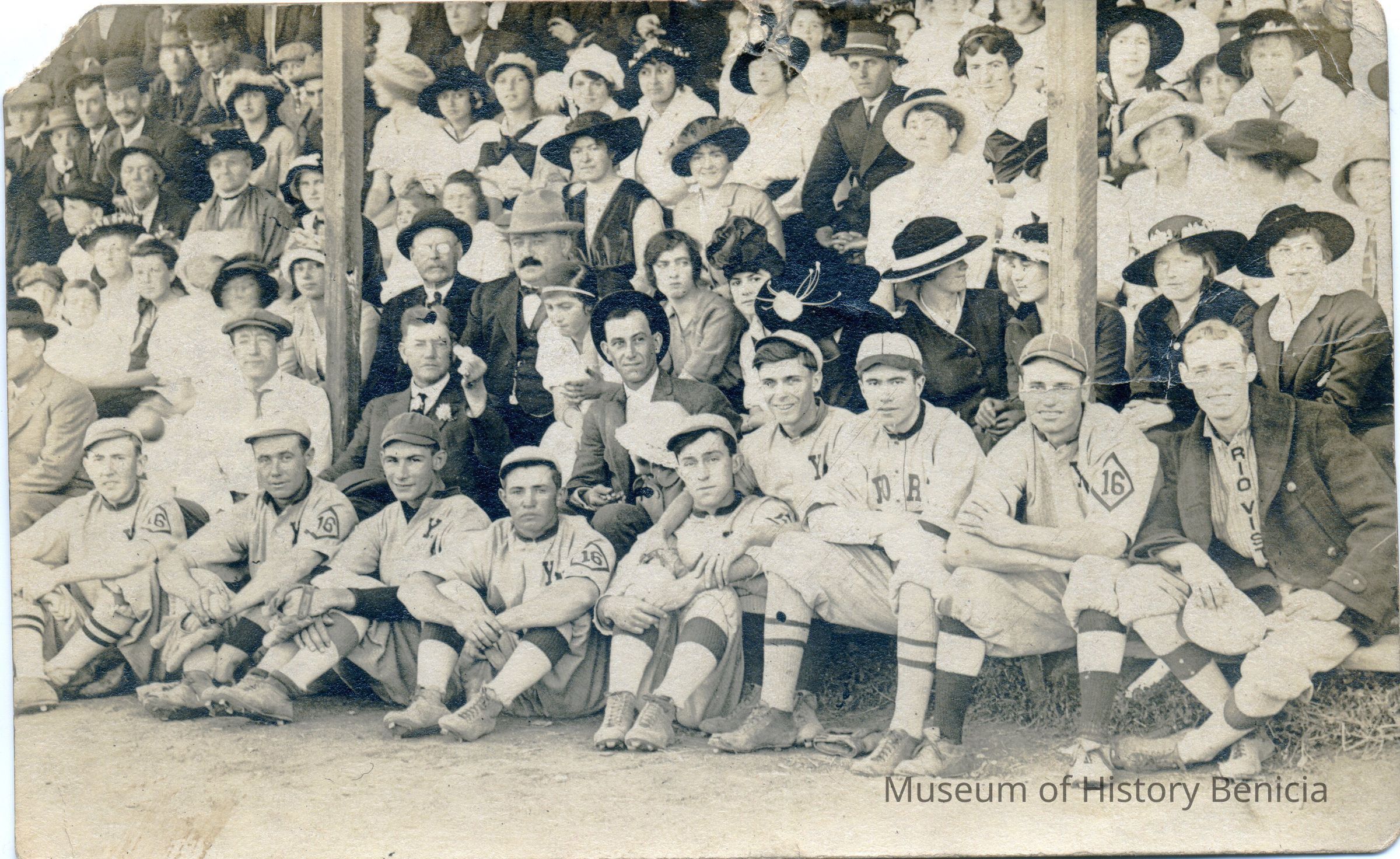 Photo of a baseball team sitting below the stands filled with people. This is a section taken from a larger photo that shows the stands and people watching a Benicia baseball game. The players have different uniforms. One says Rio Vista. Others seem to be a team that starts with "Y". The postcard is being sent to Private W.H. Pine in the Armed Forces Evacuation Hospital in "Toul?".