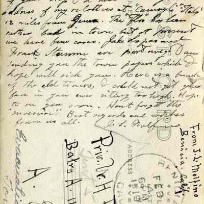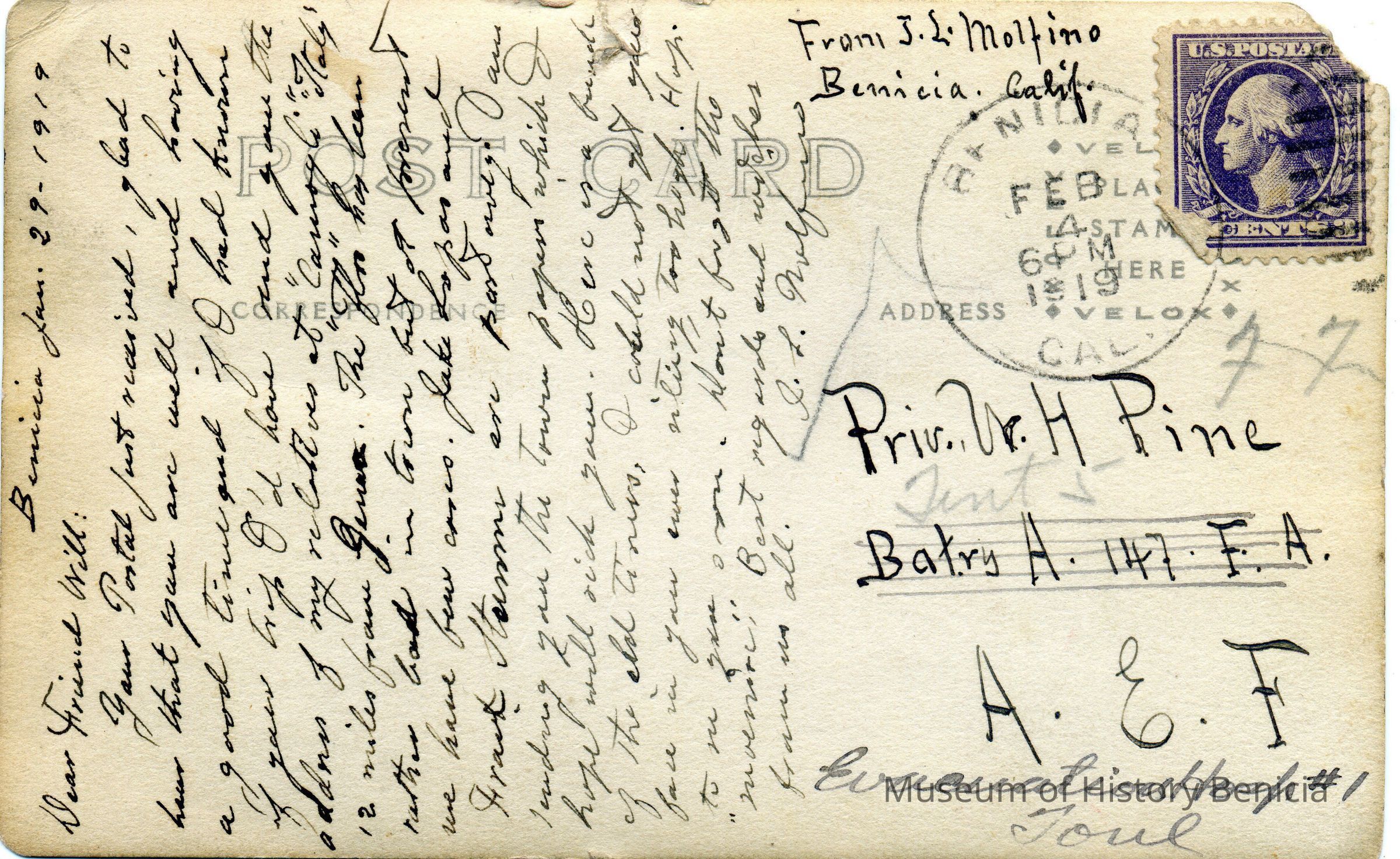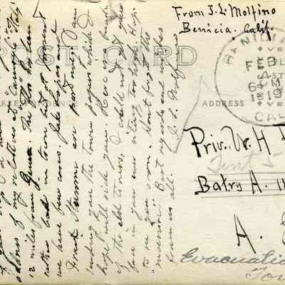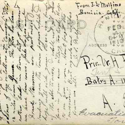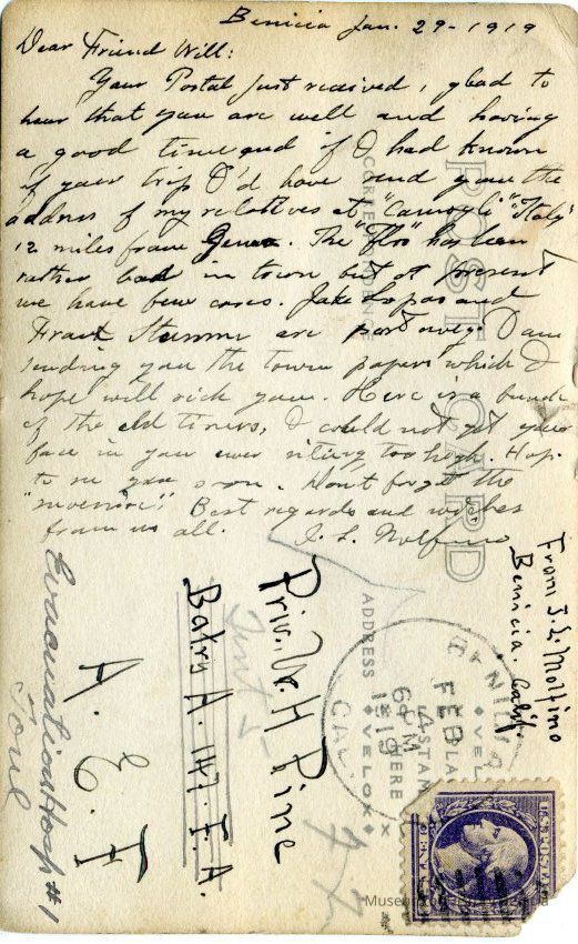 The card was written by John Molfino and the photo on the front is his photograph (we have his negative). He talks about the flu epidenic in Benicia and the fact that Frank Stumm and Jake Lopas have died of the flu. Molfino also talks about wishing he had known that Pvt Pine was going to Italy so he could have sent him an adddress for his relatives outside Genoa.Collection